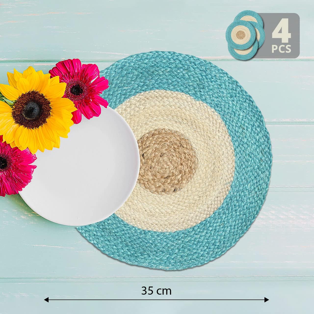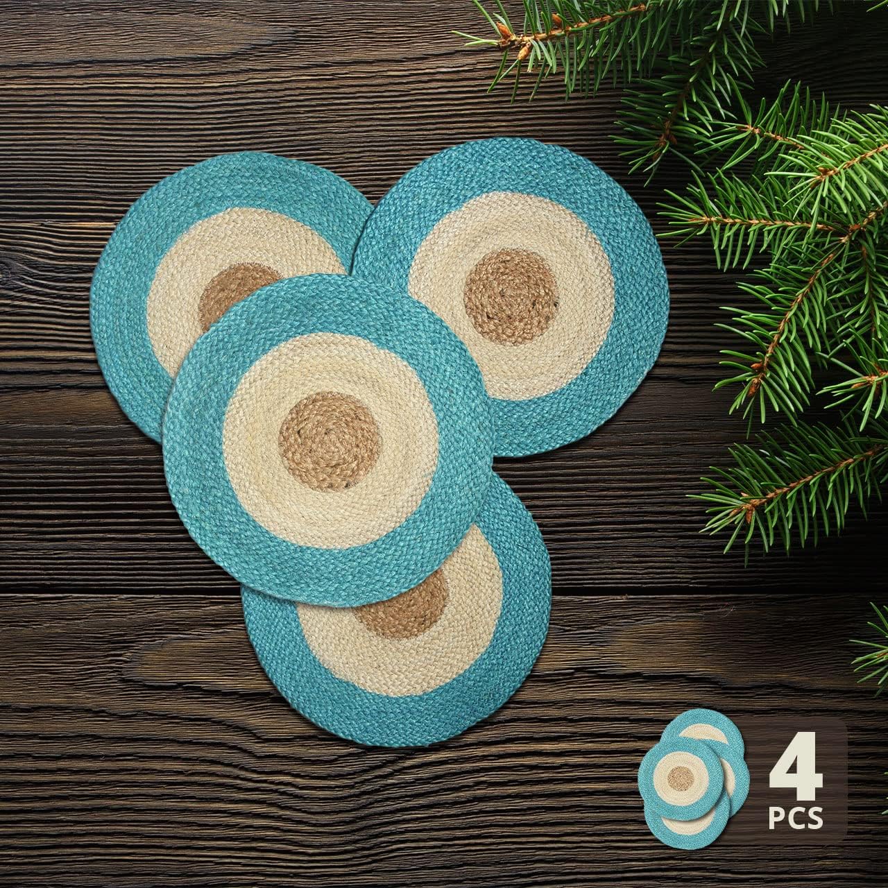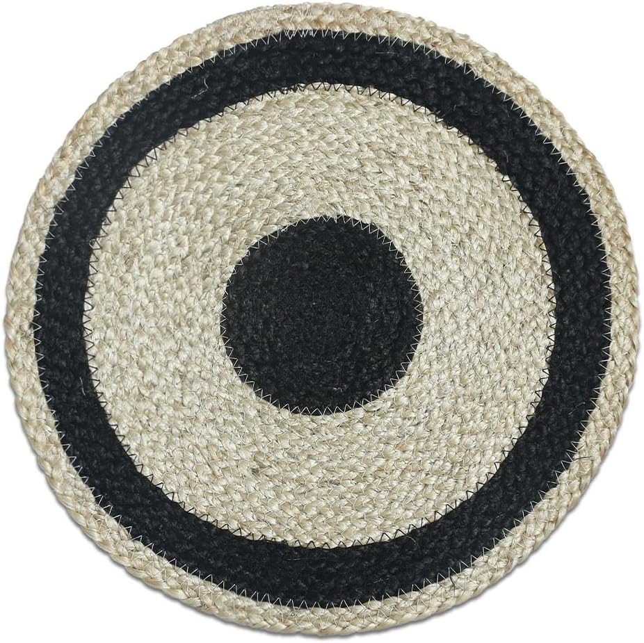These High Quality Round Shape Natural Jute Placemats are made of 100% environment friendly and compostable jute Fiber. Extra Thickness is perfect for heat insulation and can protect your table top from everyday scratches. You can use it as placemats for plates and Trivets under hot pots/pans/teapots. Non Slip, Heat Resistant and wipeable with damp cloth. Stylish Black and Natural Mix jute color combination will add more fun to your elegant dining table at whether it is at your Home or Restaurant. These place mats are handmade with Green Jute Plant that produces Strong Golden Color Fibers. Our Rural Artisans Braid the Golden Fiber into ropes and knit them as placemats which are FAIR TRADED. Size: 35cm Diameter and 1 Package Includes a Set of 4 Hand washable Place Mats. You can clean with brush and detergent. Immediately clean up spills with damp cloth or paper towel. Don't allow spills to set otherwise it will be difficult to remove. Natural Jute Placemats boxed in flat plastic bag may have natural burlap scent. Air it to Get rid of smell. Air it with sunlight to Get rid of the smell or Clean with damp cloth adding some detergent or sprinkling a little bit of baking soda to deodorize the odor. Each placemat is uniquely hand braided therefore a set of 4 might be slightly different than one another. Placemat finishing may vary from one another. Store in a Dry Area.