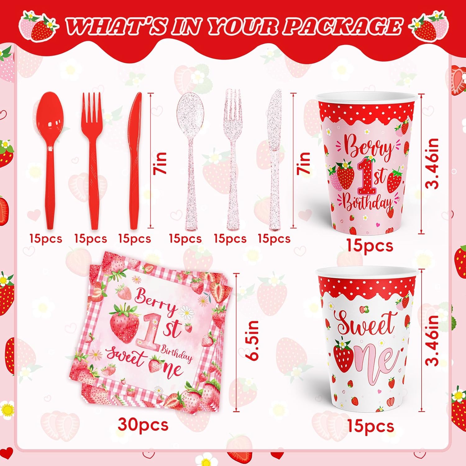 212ps Berry First Birthday Decor Strawberry 1st Birthday Paper Plates Cups Napkins Tablecloth Forks Tableware Berry 1st Bday Party Supplies Sweet One Girls Strawberry Baby Shower Decorations Serve 30