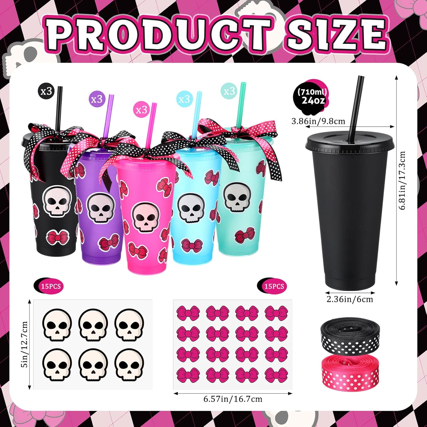 Features: These cups are safe to put in the dishwasher, brining you a smooth and comfortable using experience. You can DIY cups by using stickers and ribbons After receiving the goods, do not use force to open them hard, just lay them flat and pull them out. Before the goods are shipped, they are strictly checked and the boxes are properly packaged Specifications: Material: Cups: polypropylene, plastic Stickers: PVC Color: Cups: rose red, lake green, sky blue, purple, black Stickers: pink Size: Cups: about 10 cm/3.94 inches in diameter, 17.5 cm/6.89 inches in height Capacity: about 24 oz/ 710 ml Stickers: about 6.57 x 5 inches/ 16.7 x 12.7 cm Package includes: 15 x Plastic Cups 1 x Skull sticker 1 x pink bow sticker 2 Rolls ribbons Notes: Manual measurement, please allow slight errors on size. The color may exist a slight difference due to different screen displays.