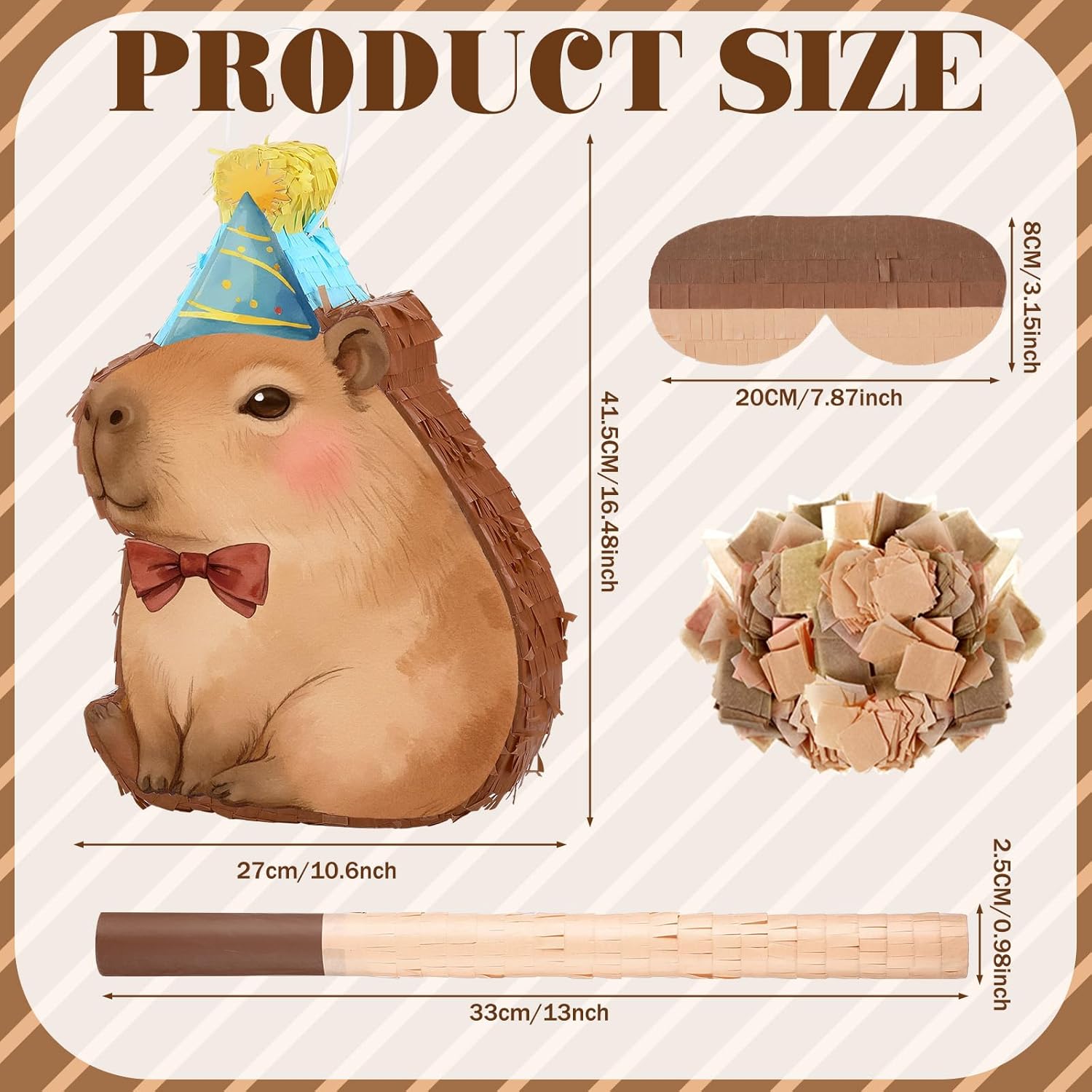 Features: These capybara birthday party supplies can be applied on a variety of occasions, such as birthday parties, holiday parties, cow themed parties and so on, adding a festive and joyful atmosphere to these occasions. You can send these capybara birthday decorations to your family members or classmates on holiday or birthday, as distinctive presents, to show your kindness and concern, and promote your relationships. Specifications: Material: paper Color: brown Piñata size: 15.75 inches/ 40 cm Package includes: 1 x Capybara Piñata 1 x Blindfold 1 x Stick 1 x Confetti Notes: Manual measurement, please allow slight errors on size. The color may exist a slight difference due to different screen displays. Suitable for people over 12 years, please use them under the supervision of adults