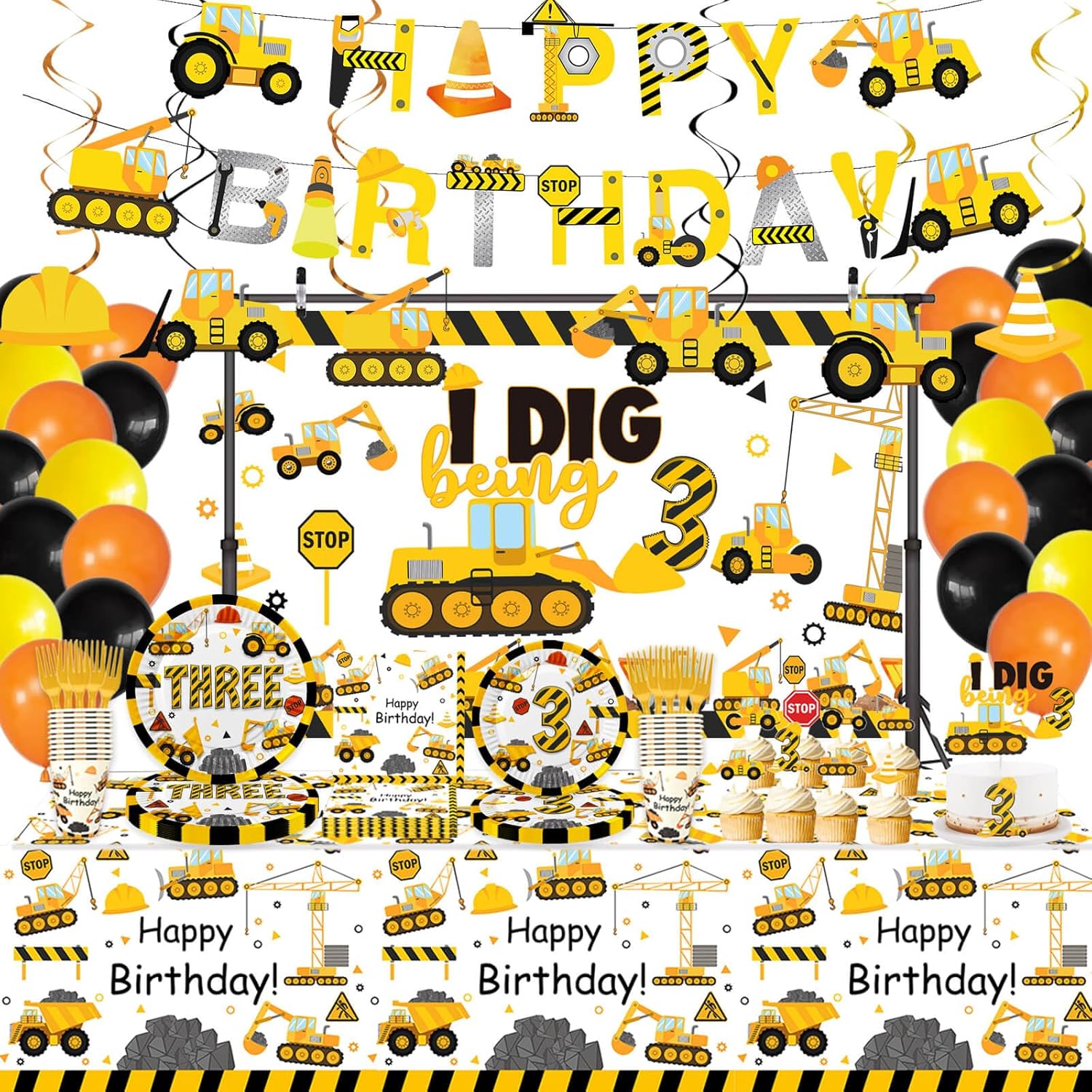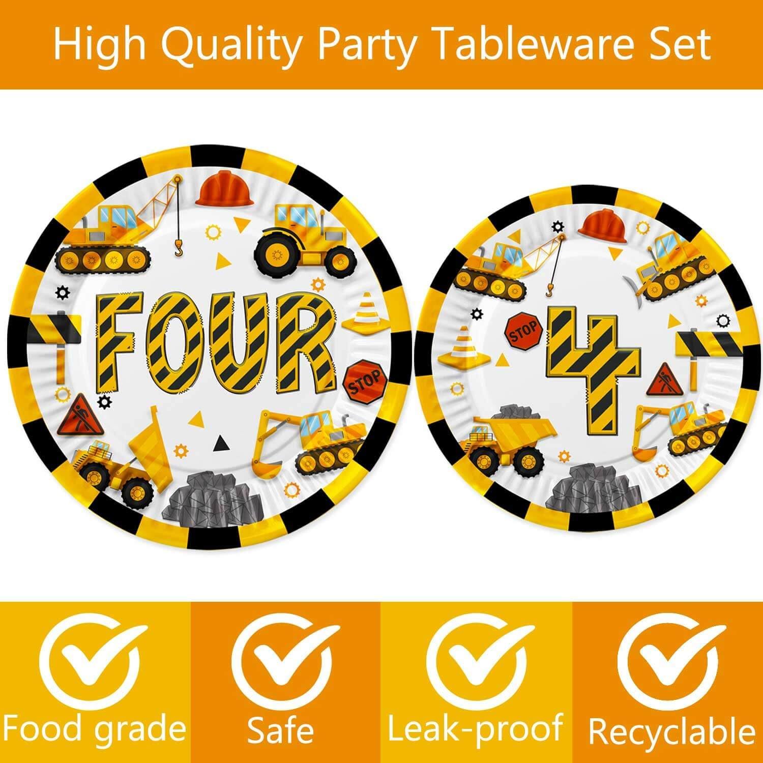 Construction 4th birthday party supplies are great to decorate Construction 4th birthday party, Construction four years old party, Dump Truck fouth birthday party, etc. Construction four years old tableware is completely disposable, no need to wash dishes or put them in the dishwasher inside after the party, and it will not increase the burden of housework. When you arrange such a theme party with your family, it will be an unforgettable memory. What's in the package: A set of happy birthday banner 1pc Construction Four Backdrop 6 pcs of Construction Hanging Swirls 2 pc 51.2" x 86.6" Table Cloth 20 pcs 9 Inch Paper Plates 20 pcs 7 Inch Paper Plates 20 pcs 6.5 Inch Paper Napkins 20 pcs 6.3" Forks 20 pcs 9 OZ Paper Cups 1 pc Construction Cake Topper 40 pcs Vehicle and Traffic signs Cupcake Topper 18 pcs 10" Latex Balloon(3 colors, each colors 6 pcs )
