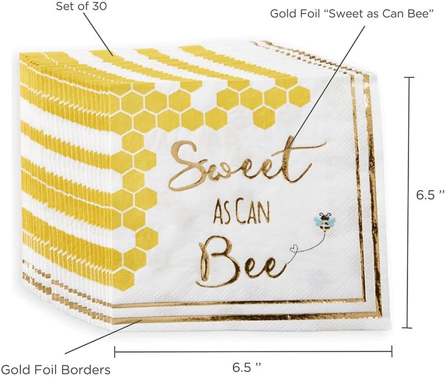 Sweet as Can Bee 7 in. & 9 in. Premium Paper Plates (Set of 16) are more than just appetizer plates or cake plates, they are a decoration theme bomb. Bringing the bee baby shower to a beautiful climax is our premium paper plates. You and your guests will bee in love with all the bee-utiful details. The bright and bold golden and yellow hues draw your eyes in immediately and set the tone for your honey bee theme. Made of the highest quality paper plates could carry all your bee-licious party food. Whether you have a delectable brunch or a buffet feast full of casseroles, our plates can stand up to anything. The base of our Sweet as can Bee collection, these hexagon honeycomb shaped plates are rimmed in gold and dripping with honeycombs in bright yellow and gold with the sweetest little bumble bees dawning the corners. Our honey bee disposable plates take your party decorations to the next level. With our wide selection in our bee baby shower collection, you can decorate from walls to table. Helping to really fill your space with the bee theme. Making your mama bee feel more like a queen bee at her baby bumble bee baby shower. Kate Aspen Sweet as Can Bee 2 Ply Paper Napkins (Set of 30) are essential for your bumble bee baby shower. Brightly colored, but never bleeding, our two ply high quality paper napkins are the top tier of paper napkins. Fit for the most formal affair and cute enough for a low-key baby shower in the backyard, our paper napkins are made of the highest quality material so that as the host you wouldn't have to worry about your guest or your furniture. We design each part of our collection to stand on its own or to complement the Sweet As Can Bee collection as a whole and our napkins are a bee-utiful example of this. With our Sweet as Can be on the front with the sweetest little bumble bee in the corner is perfect for a baby shower. Bee-lieve it or not, it's also perfect for summer cocktails by the water.