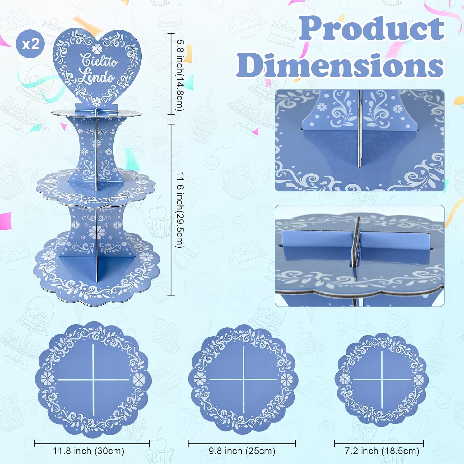 Features:Celebrate in style with this 2 Pcs Mexican-Inspired 3-Tier Cupcake Stand. Designed to bring a vibrant cultural flair to your dessert display, this stand features a colorful, festive design inspired by traditional Mexican art. Whether you're hosting a Cinco de Mayo celebration, a wedding, a baby shower, or a birthday party, this cupcake tower adds a unique and charming touch to your event.Crafted from premium cardboard, this cupcake stand is designed to handle the rigors of any party. It's easy to assemble with no tools required, and each layer fits together securely for a flawless display. After the event, the stand is reusable, making it a great value for multiple occasions.Add a festive, elegant touch to your next celebration with this vibrant, Mexican-inspired cupcake stand. It’s not just a functional dessert holder – it’s a beautiful centerpiece that will impress your guests and create lasting memories.Specifications:Material: CardboardColor: BlueSize: 17.4 inches highPackage Included:2 x Cupcake StandNotes:Due to manual measurement, there may be some errors in size.Due to different screen displays, colors may vary slightly.