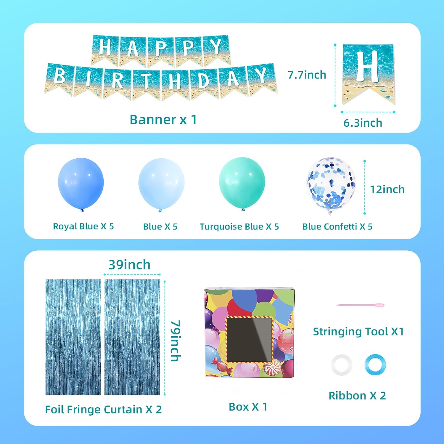 Beach party decorations supplies for 25 guests: This set of beach birthday party decorations can meet the needs of 25 guests, including everything you need for a birthday party, completely fulfilling your requirements. Charming Design:The ocean birthday party decorations tableware set, inspired by the ocean, sea, and beach, incorporates starfish, seashells, shimmering waves under the sun, and deep blue ocean designs to capture the essence of sun, sand, and waves, creating a refreshing summer vibe, with colorful balloons, sweet candies, and flowing ribbons on the packaging box, which can be used as a gift box without extra packagingPremium Quality: Durable summer ocean plates and cups can handle all your favorite party foods; safe, non-toxic plastic utensils ensure worry-free dining; and a waterproof ocean tablecloth makes cleanup a breeze Hassle-Free: Disposable items allow for quick setup and cleanup, letting you focus on enjoying the beach party with your friends and familyVersatile for All Occasions: Our beach party supplies are perfect for any occasion, including Hawaiian birthday party, ocean themed party, baby shower party, pool party, summer birthday party, and ocean theme weddings. Without using the banner, the remaining parts of the set can still fully decorate the entire party, such as a bridal beach party celebration or under the sea parties . This beach party supplies kit is perfect for creating an unforgettable, sun-soaked celebration that everyone will enjoy Package Contents:25 beach theme plates (9") 25 beach theme plates (7") 25 napkins (6.5") 25 paper cups (9 oz) 25 plastic beach cutlery sets (forks, spoons, knives, 6.7") 1 beach theme birthday banner (not pre-strung) 2 beach theme tablecloths (54" x 108") 2 blue tinsel foil fringes (39" x 79") 20 latex balloons in beach colors (4 colors, Royal Blue, Blue, Turquoise Blue, Blue Confetti, 12 inch)