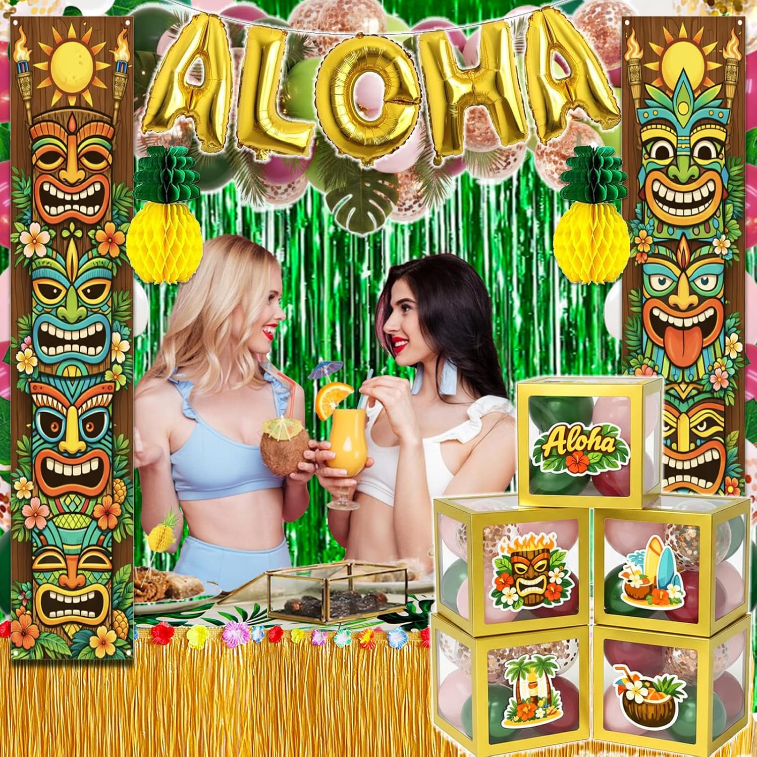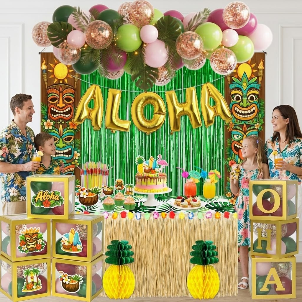 | Included Components | 1 x Hawaiian-themed tablecloths, 1 x 9' Hawaiian banquet table skirt, 20 x 3D honeycomb cake sticks, 30 x umbrella decorations, 12 x palm leaves, 25 straws, 2 x pineapple honeycomb center decorations, 50 x latex balloons, 1 x "Aloha" foil balloon banner, 2 x Tiki Totem Door banner, 2 x fringe curtains, 5 x card, 5 x balloon boxes, 4 x velcro, 1 x ribbon, 1 x gule dot, 1 x golden dot,1 x balloon strip. |
