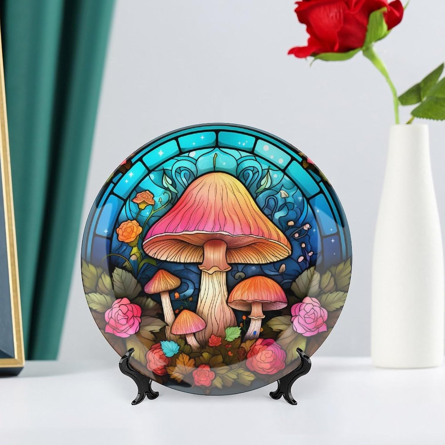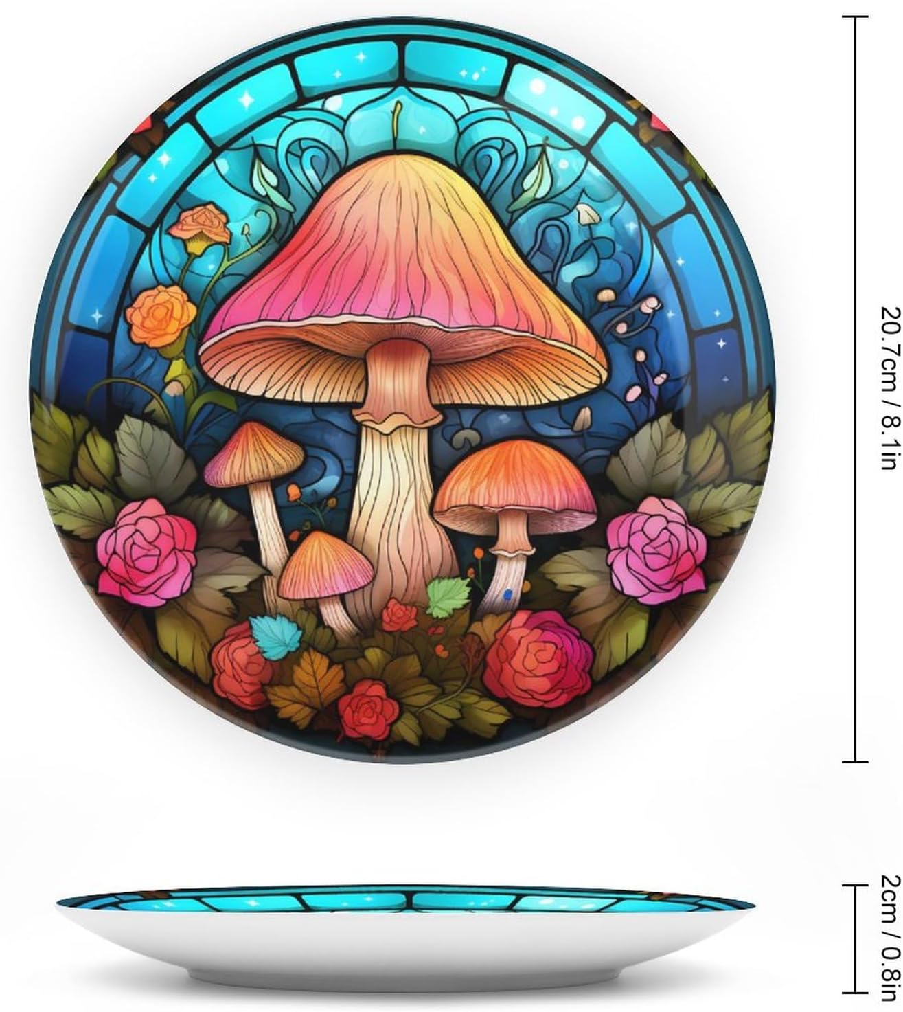 GOKAYS DECORATIVE PLATEDo you feel that your table is monotonous? Then use our decorative plate to add a little fun to the monotony of life.FEATURESSIZE - 8 Inch diameterMATERIAL - CeramicDESIGN - Mushroom Teal Stained Glass PaintingPACKAGE - 1 x Ceramic Decorative Plate, 1 x Stand, 1 x PothookWHY CHOOSE GOKAYS DECORATIVE PLATES?ADVANTAGEAs Manufacturers We Follow Current Trends and Bring You the Latest Home Fashion. No dye substance harming the health of you and your family, and more than 1300 high temperature fired in the kiln, never fade color. Ideal for placement at home or in the office. Traditional porcelain making technology, fine workmanship. It is a good gift for family and friends.CONVENIENT TO USEOur decorative plate rack for display has 2 ways to use, you can just place the bracket base on a flat surface first, and then put the plate on it, also you can stick the provided pothook at the back of the plate, and then stick the plate on the wall, you can choose the suitable installation method according to the actual situation.OCCASIONOur ceramic plate is a perfect decorative and collection for any niche, table, or mantle at your home. Perfect for your office, home, living room, dining room, playroom, kids room, kitchen, cafe, study, studio, club, bar, and others.IN A SURPRISE FOR YOUR FAMILY AND FRIENDS!It's a perfect gift for any person in your life. You can give it directly to your lover as Mother's Day Gift/Father's Day Gift/Birthday Gift/Christmas Gift/Valentines Day Gift/Anniversary Gift/Wedding Gift/Housewarming Gift/New Home Gift.Start with our funny decorative plate, refresh your rooms!