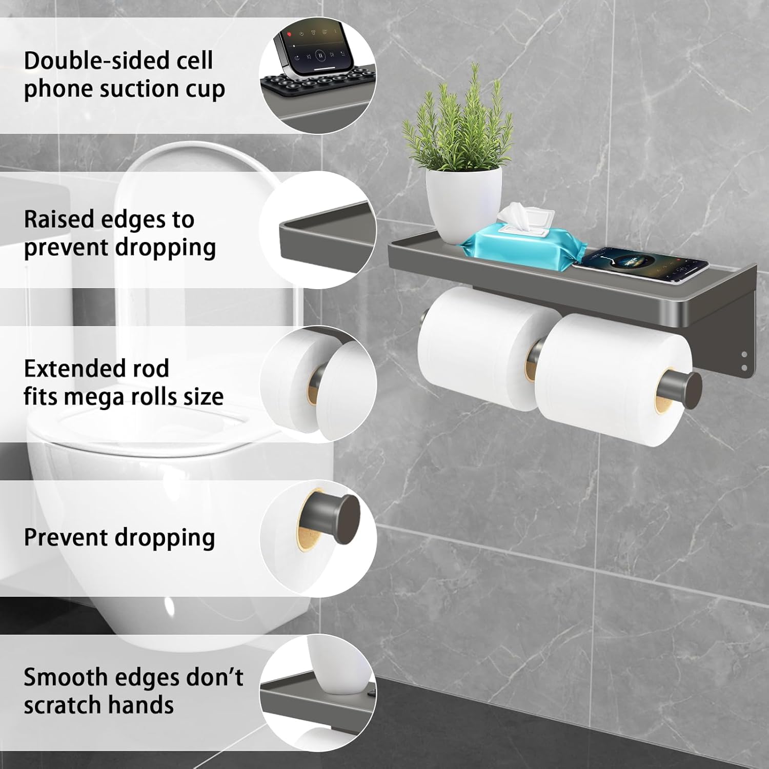 NUOGAO bathroom tissue holderAre you looking for a stylish, versatile and easy-to-install toilet tissue holder for bathroom, toilet, restroom, shower, camper or kitchen? Try our bathroom toilet paper holder with Cell Phone Holder,As restroom organizer, it will bring you surprise and convenience.What makes our dual roll toilet paper shelf different from other products on the market? 1.As restroom organizer, Its countertop is large enough to hold a variety of items, such as baby diapers, small electronics and even iPads, hand sanitizer, extra paper towels, vases, etc.2. Raised edges prevent any possibility of falling items on the countertop, especially smooth cell phones.3. Dual rolls of toilet paper storage, so there will be no embarrassing situation of running out of one roll of toilet paper and not enough to use it up.4. Unlike all the toilet paper holders in the market, our NUOGAO toilet paper storage holder is also equipped with double-sided suction cups for cell phone fixing, so you can place your cell phone playing video at various angles, even iPad can be handled easily.STRONG AND DURABLE TO HANG ON THE WALL - NUOGAO Bathroom Paper Towel Holder is made of high quality thick aluminum material, which makes it stronger and more durable to hang on the wall.ENVIRONMENTALLY FRIENDLY - NUOGAO double roll toilet paper towel holder is the perfect hardware to replace the old paper towel holder, and also a suitable choice to cover the existing shortcomings of the old paper towel holder, elegant style and fashionable shape.EASY INSTALLATION - You can choose two installation methods according to your own wishes.Package Includes❶ Double roll toliet paper holder with shelf❷ Cell phone suction cup X 1❸ Screw mounting kit X 1❹ No-punch adhesive X 1❺ Installation Instructions X 1