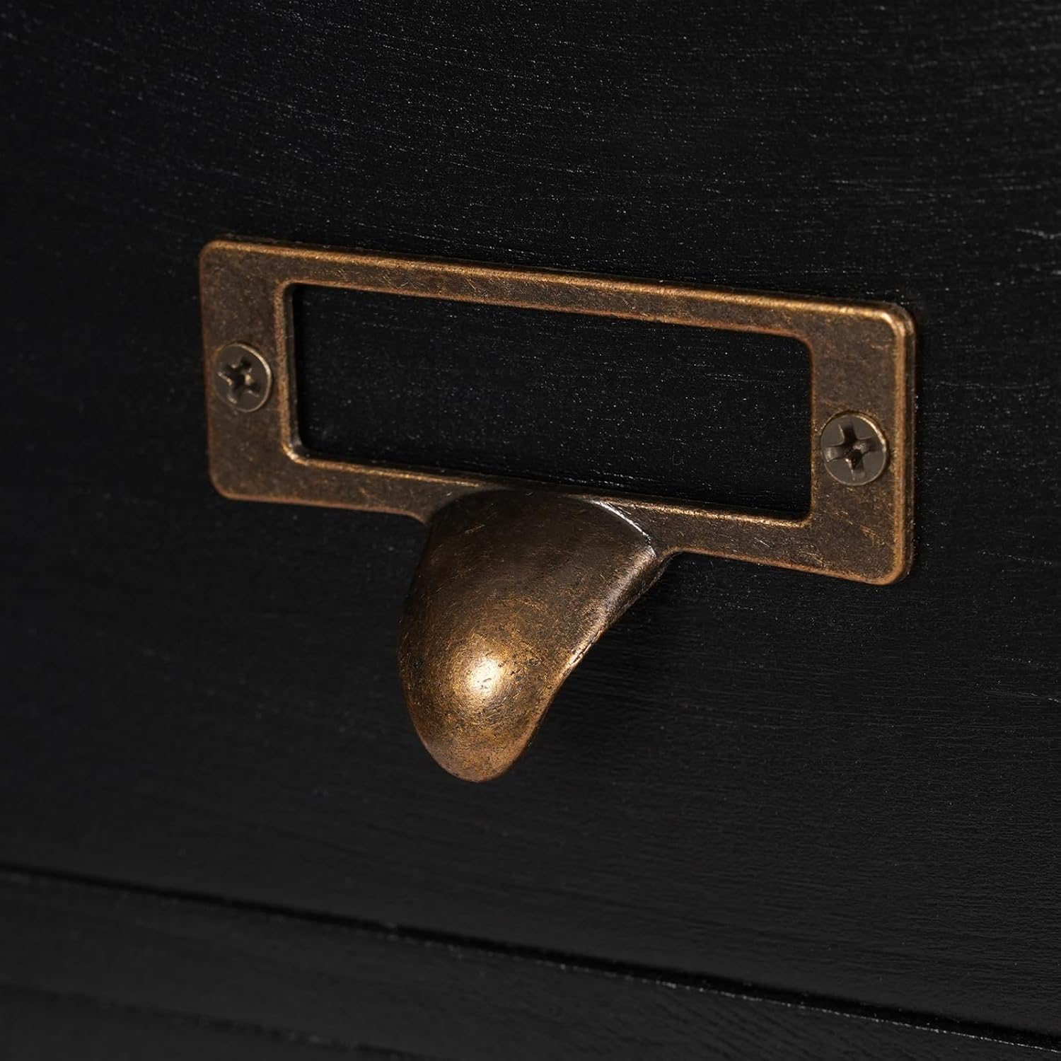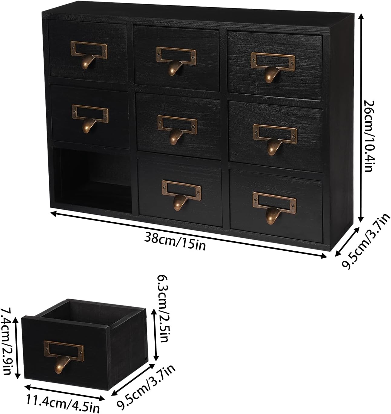 Details Rounded Corners: The rounded edges are burr-free, which is comfortable to touch and can care for your skin.Metal Handles: Ergonomically designed metal handles allow you to pull drawer doors open or close with ease.Tag Slot: It allows you to place labels for the items, making it easier to reach items, and saving you time rummaging. ApplicationIt is suitable for placing in your living room, dresser, kitchen, office, etc., to store necklaces, earrings, bracelets, rings, crystals, cosmetics, perfumes, lipsticks, tea bags, espresso packets, sugar packets, keys, watches, receipts, credit cards, electronics, small cords, chargers, batteries, pens, letters, staples, tape holders, sewing needles, buttons, tool bits, small precision tools, herbal remedies, nutrition-related capsule/tablet bottles, apothecary jars, household medications and general small items.SpecificationMaterial: Wood and MetalColor: Blue/BlackStyle: RusticProcess: PaintingShape: RectangularAssembly Required: NoMounting Type: TabletopNumber of Drawers: 9Each Drawer Size: 11.4*9.5*6.3cm/4.5*3.7*2.5inDrawer Door Height: 7.4cm/2.9inProduct Size: 38*9.5*26cm/15*3.7*10.2inEach Drawer Load Capacity: Within 1kg/2.2lbsNet Weight: 2.5kg/5.5lbsPackage Included1* 9-Drawer Storage Cabinet Notes1. Please check the product size before purchasing. 2. Please note that the log product is subject to wood knots, scabs, mineral threads, etc., but it's normal. Please make sure that you do not mind before purchasing.3. Please note that this product does not include keys and other storage items.
