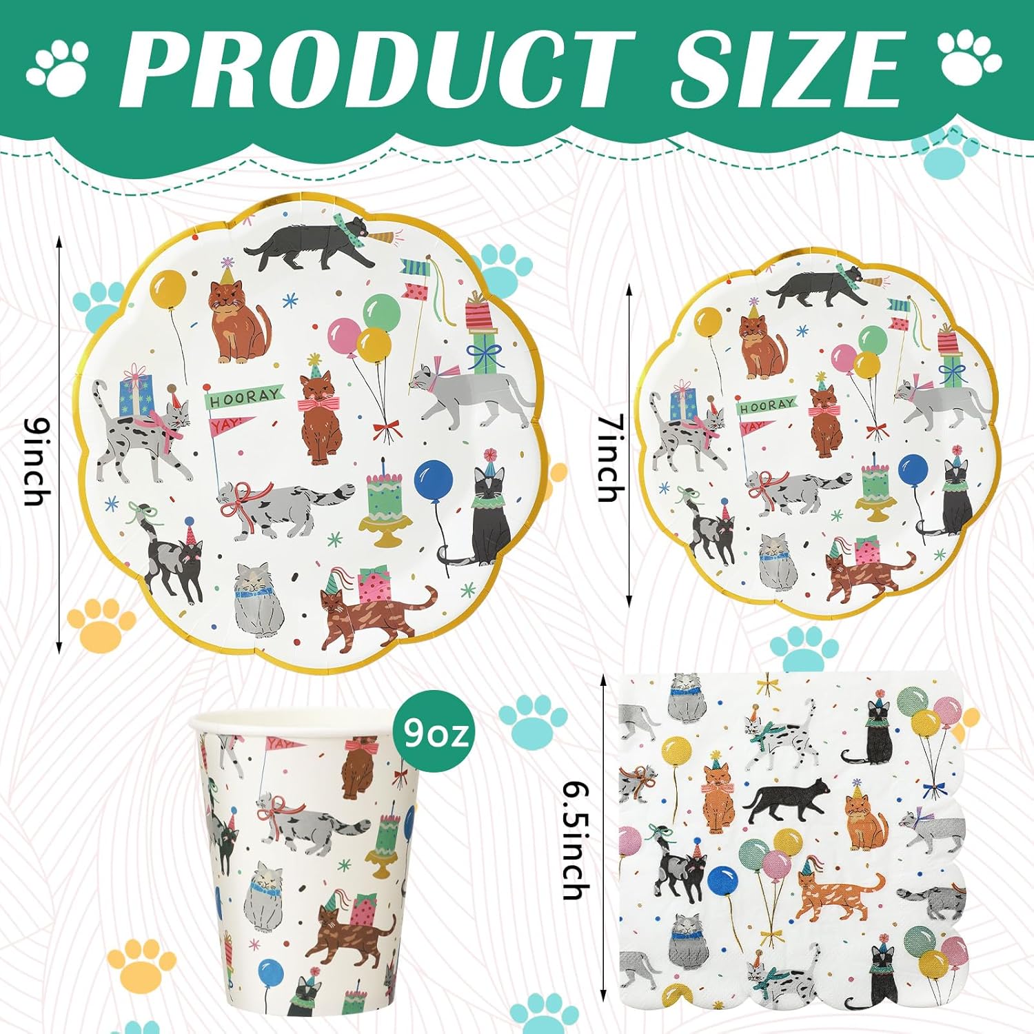 Features: All of our themed plates and napkins are made of durable quality paper, disposable design, easy to clean up, saving you time Suitable for all occasions, enhance the party atmosphere, set the tone for any party, make your party more interesting and attractive Specifications: Material: paper Color: multicolor Size: Cat theme dinner plates: 9 inch Cat party plates: 7 inch Paper napkins: 25 5 X 5 inch Paper cups: 9 oz Package includes: 25 X Cat theme dinner plates 25 X Cat party plates 25 X Paper napkins 25 X Paper cups Notes: Manual measurement, please allow slight errors on size. The color may exist a slight difference due to different screen displays