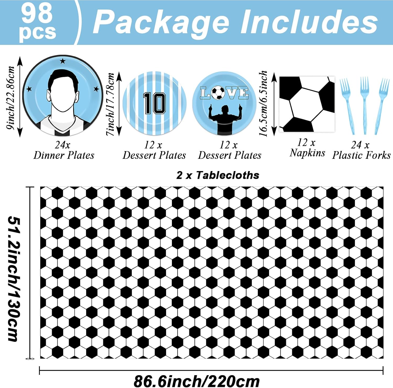 | Included Components | 2 waterproof soccer tablecloths (108 x 54 in), 24 blue plastic forks, 24 large dinner plates (9 in / 23 cm), 24 small dessert plates (7 in / 18 cm), 24 soccer themed napkins (6.5 in / 16.5 cm) |