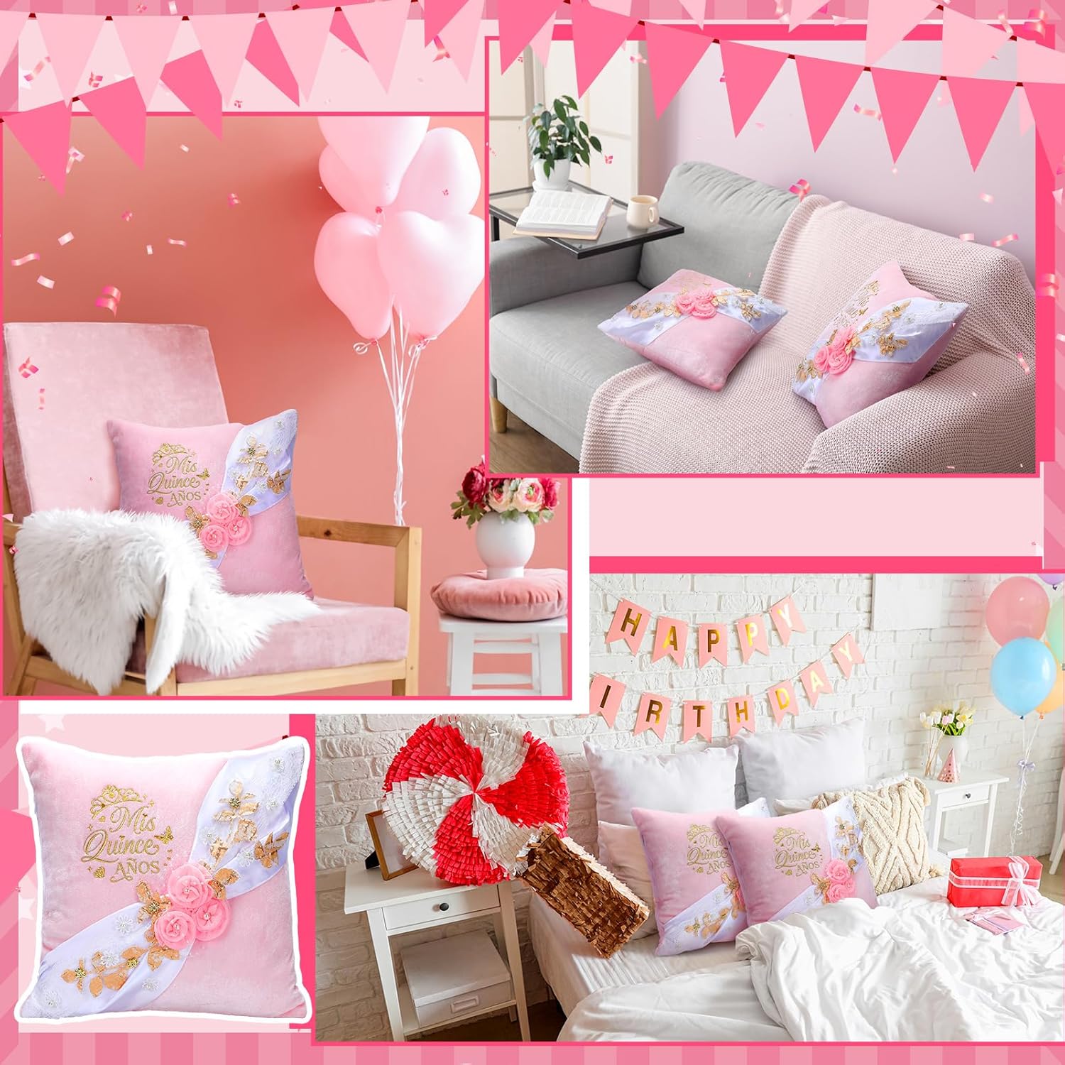 Features: Our Quinceañeras themed pillowcase carries the gift giver's way of expressing love, full of love and warmth, making it a special gift given to her. When she sees the gift in the future, it will be a beautiful memory and commemoration. This pillowcase is also a 15th girl birthday gift ideas party decoration. You can put it in the living room, sofa, bedroom or outdoor chair. Specifications: Color: pink, white Size: 16 x 16 inches/ 40 x 40 cm Package includes: 2 x Quinceanera pillow set Notes: Manual measurement, please allow slight errors on size. The color may exist a slight difference due to different screen displays.