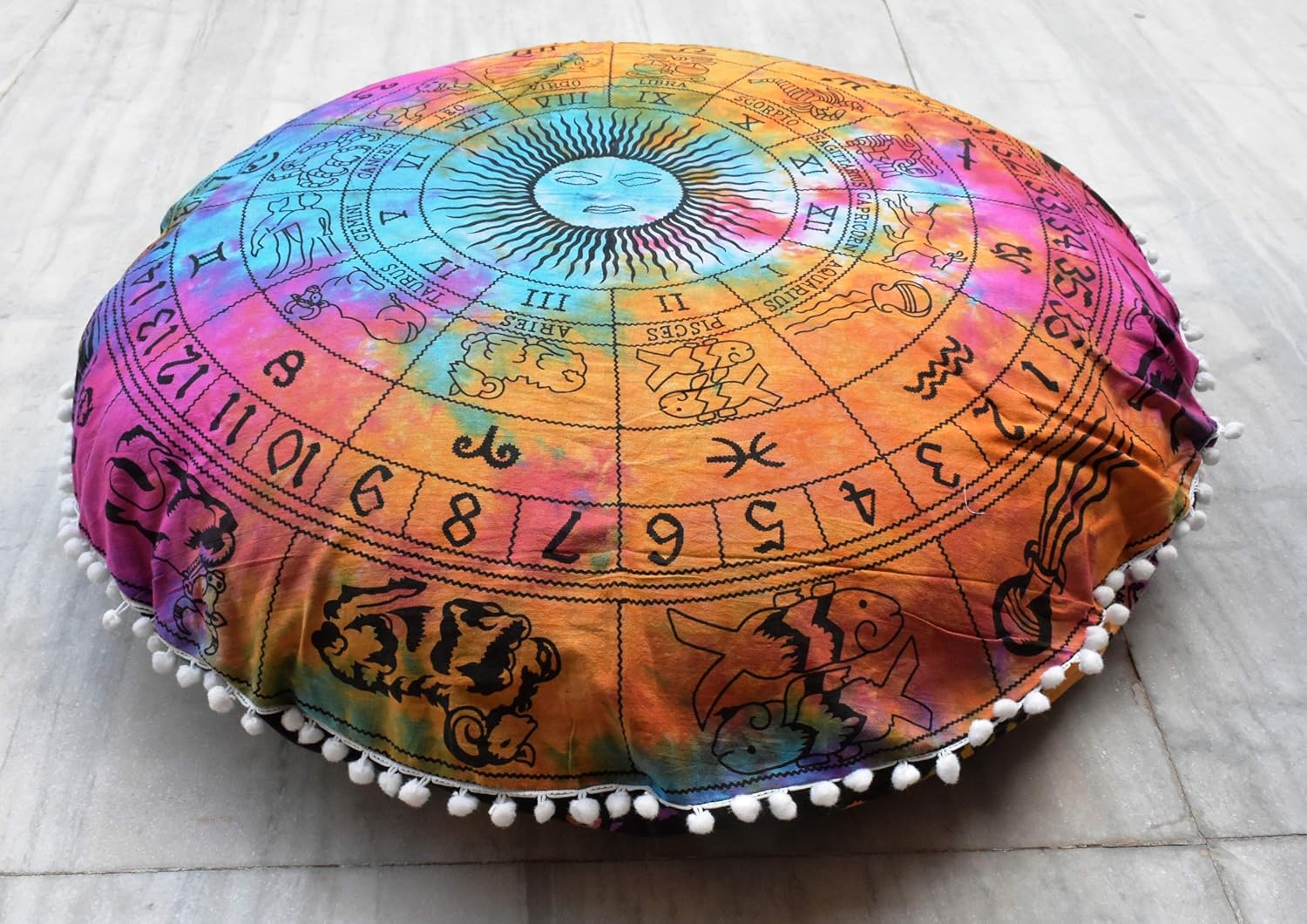 A Gorgeously Crafted, Intricately Detailed Ecliptic Wheel Featuring the 12 astrology signs , including Aries, Taurus, Gemini, Cancer, Leo, Virgo, Libra, Scorpio, Sagittarius, Capricorn, Aquarius, Pisces! and their respective relationships to the phases of the moon. Mandala Floor Cushions are the perfect home decor piece to create a bright, unique (and extra comfy) space. Poufs are great to use as floor pillows around the house, also to use as watch TV or as an extra seat. Great as a Picnic, gift, holidays. This Beautiful Mandala Tapestry Floor Pillow cover is made by Best Quality Cotton Fabric and is super soft to the touch.. You can place them in bed room, Living room or even use them for decoration in your house. You can sit on it, relax your feet upon it or use it as a decorative piece by adding a blast of color to your living space. These pillows can be mixed with contemporary,Modern or traditional decor, A Charming pillow Cover With Pom Pom Lace. They are attractive as each one is a art and adds to your collection. Just another dimension of Incredible India! : Actual Product may differ slightly in color then the photographs depending upon the screen resolution.