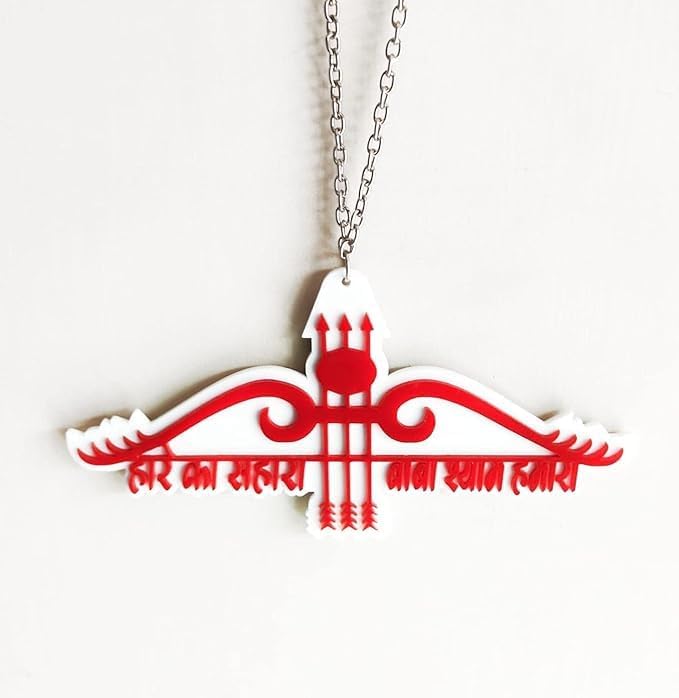 Bring a touch of spirituality to your car's interior with this acrylic dashboard showpiece. Featuring the sacred mantra 'Hare Ka Sahara Baba Shyaam Hamara' in intricate red and white print, this 6 x 4 inch hanging decoration is a beautiful way to honor your faith while driving. Crafted from durable acrylic, it's designed to withstand the rigors of the road. Hang it from your rearview mirror or attach it to your dashboard for a constant reminder of divine protection. With its eye-catching design and meaningful message, this car accessory is a must-have for devotees of Lord Shyam. Please note that measurements are approximate.