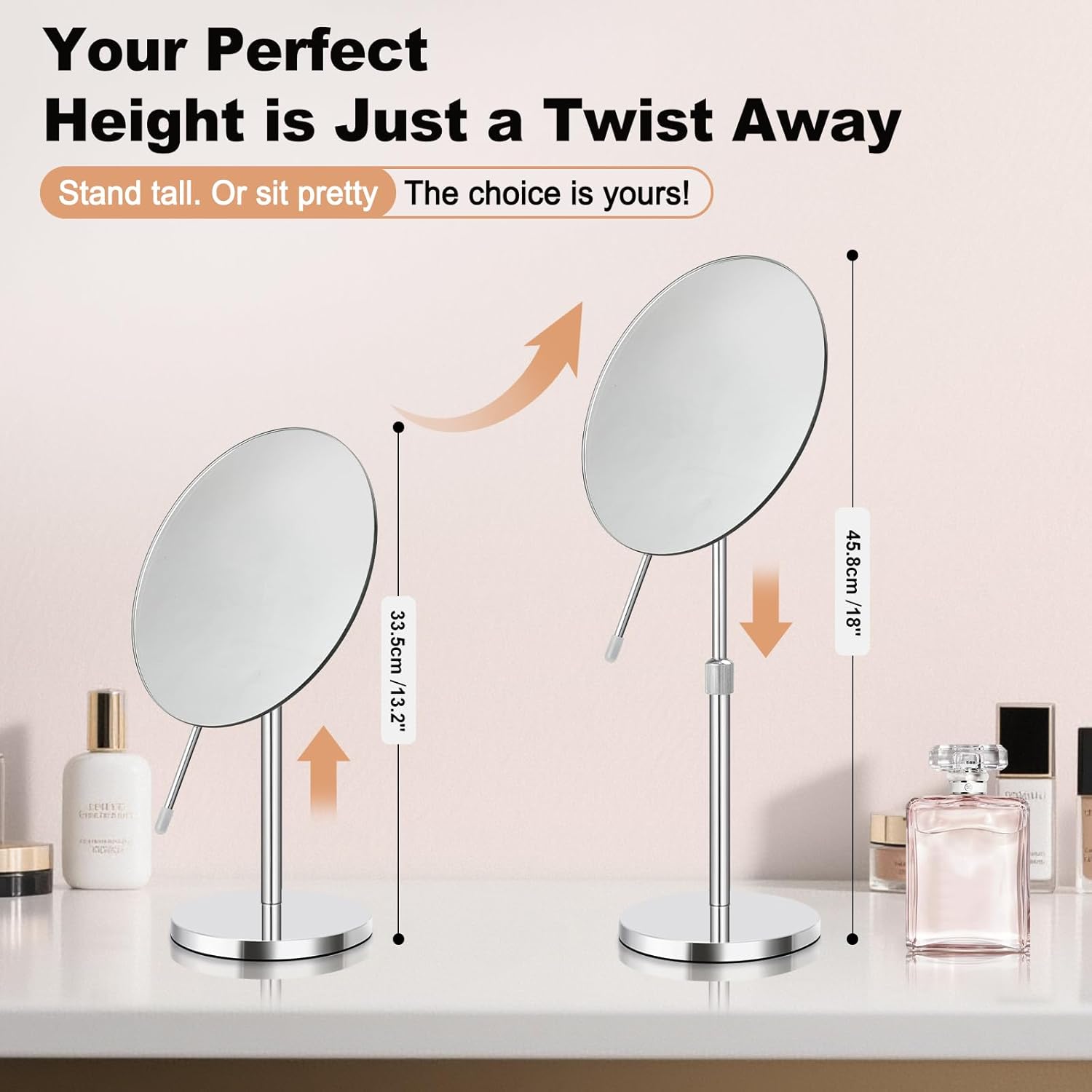 | Additional Features | 8-Inch High-Definition Glass Mirror, Adjustable Height, Detachable 10X Magnifying Suction Mirror, Elegant Chrome Finish, Flexible Swivel Design |
