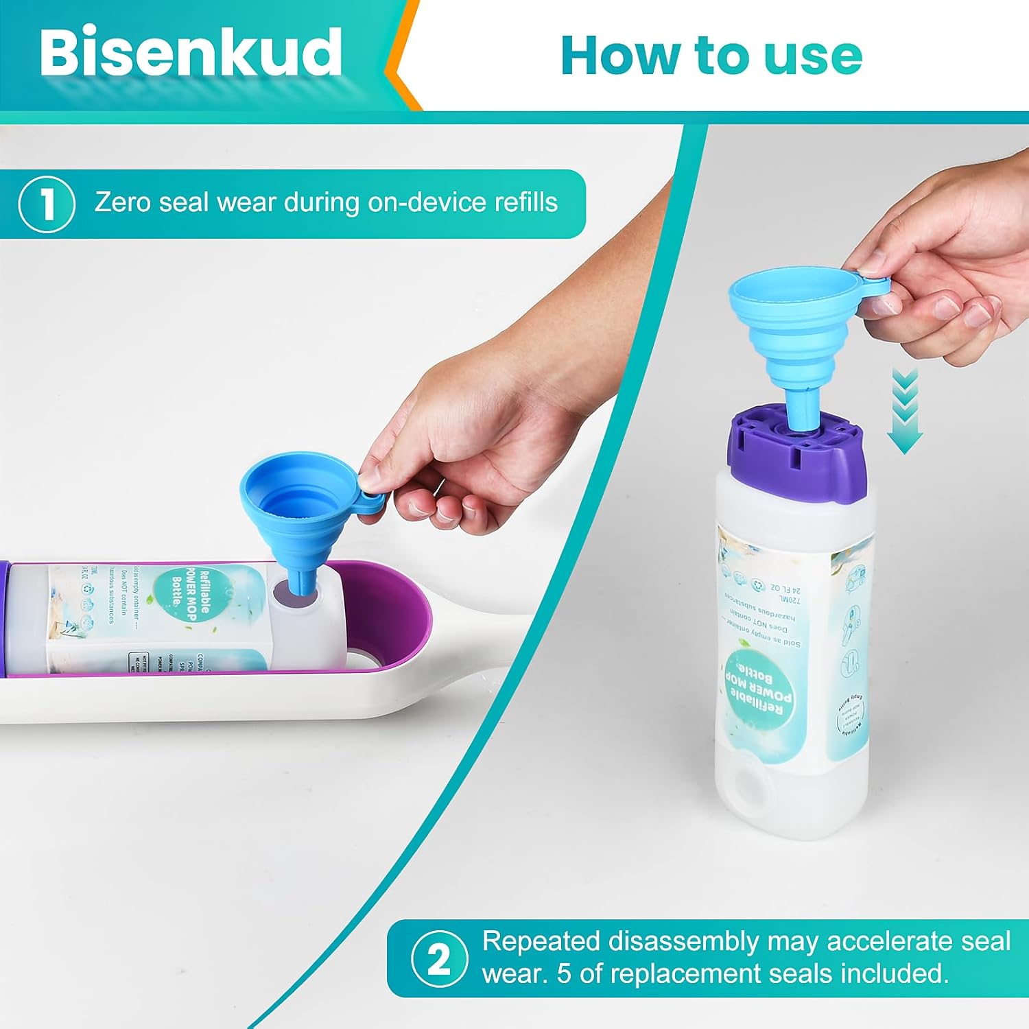 Upgrade your PowerMop with our reusable solution bottle. With a practical 720ML (24 FL.OZ) capacity, this container is designed to reduce refill frequency while giving you the freedom to use any liquid cleaner you prefer. Engineered for a secure, leak-resistant fit exclusively on PowerMop bases, it's the economical and sustainable choice for a smarter clean