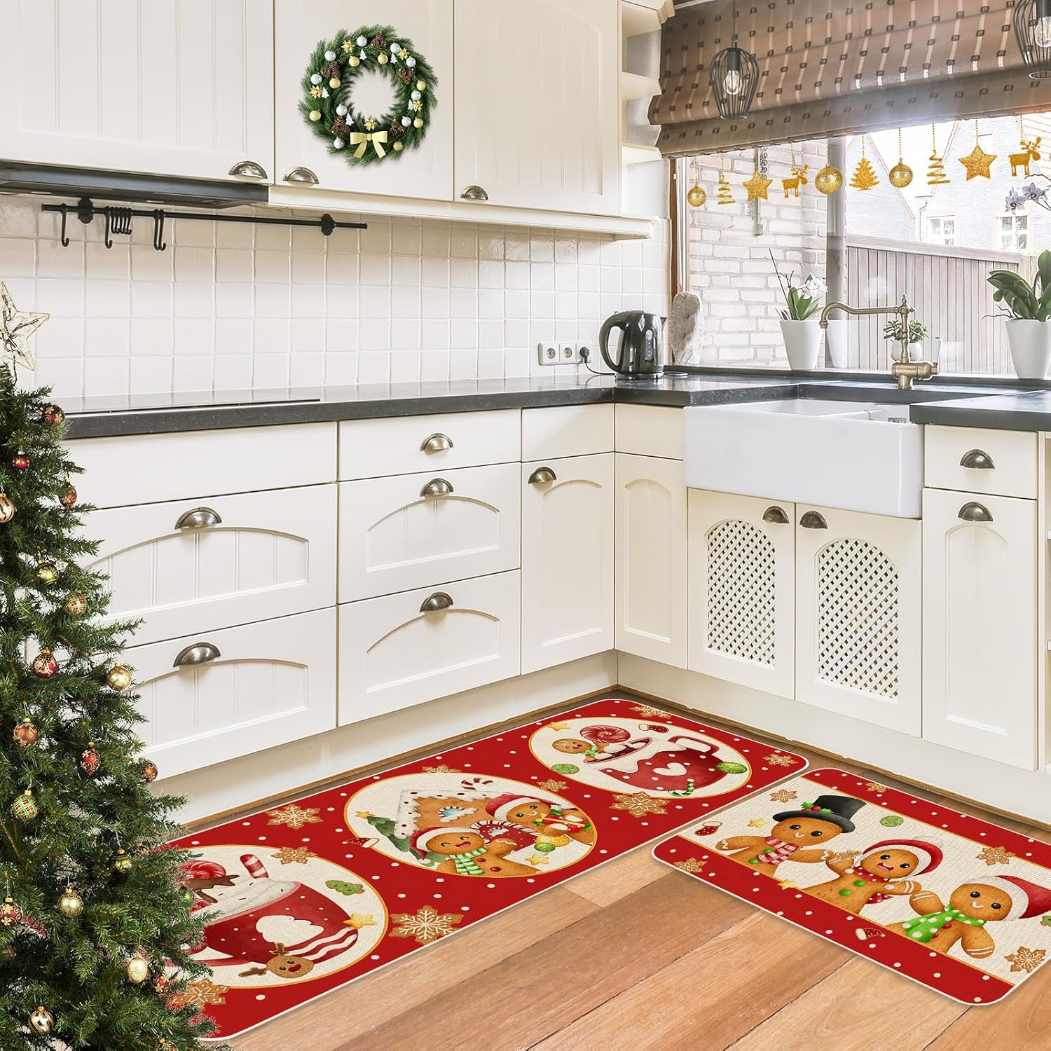 Features: Festive design: Our kitchen rugs are patterned with Christmas gingerbread and snowflake elements, full of festive vibe, which will create rich holiday atmosphere for your home and other places Wide application: Perfect for both indoor and outdoor use, you can put them at the front door, entryway, porch, balcony, kitchen, living room, bedroom, laundry room, bathroom, office, etc Specifications: Size: 17 x 47 inch( longer ); 17 x 29 inch( shorter ) Material: linen Package includes: 2 x Kitchen Mats Notice: Doormats are packed in rolls and may not be flat when received. It can be pressed with heavy objects without affecting normal use