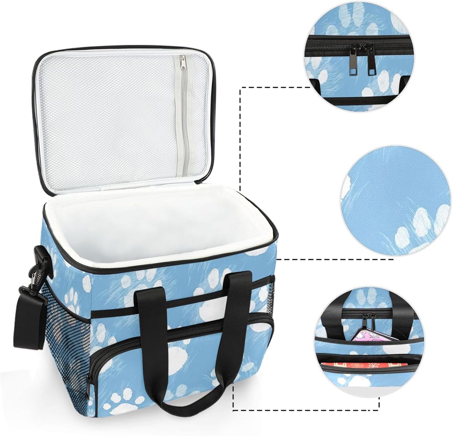 SPECIFICATION Material: polyester (external) + PEVA (inner) Size:12"(L) x 8.8"(W) x 10.2"(H) / 30.5(L)*22(W)*25.5(H)cm Capacity: 15L (can hold 24 bottles of 330ml cans, or 12 glass bottles of 330ml beer) Package includes: 1*lunch cooler bag + 1*shoulder strap FEATURES -Large storage space. -High quality fabric, fine stitching, firm and durable. -Smooth and sturdy zipper. -Waterproof and leak-proof inner liner, BPA-free, safe and environmentally friendly. -Excellent heat preservation, cold retention and freshness. -Elegant and fashionable design, fine and beautiful pattern. OCCASION Suitable for dining at home or outdoors. Such as work, office, picnic, beach, camping, hiking, etc. WASHING INSTRUCTIONS Not washable, can be partially scrubbed; not dry cleaned, can not be ironed. SERVICE We adhere to the service concept of providing customers with quality products, if for any reason you are not satisfied with the quality of your purchase, please do not hesitate to contact us, we will promptly reply to you and solve your problems until you are satisfied. Thank you very much for supporting our products, thank you.