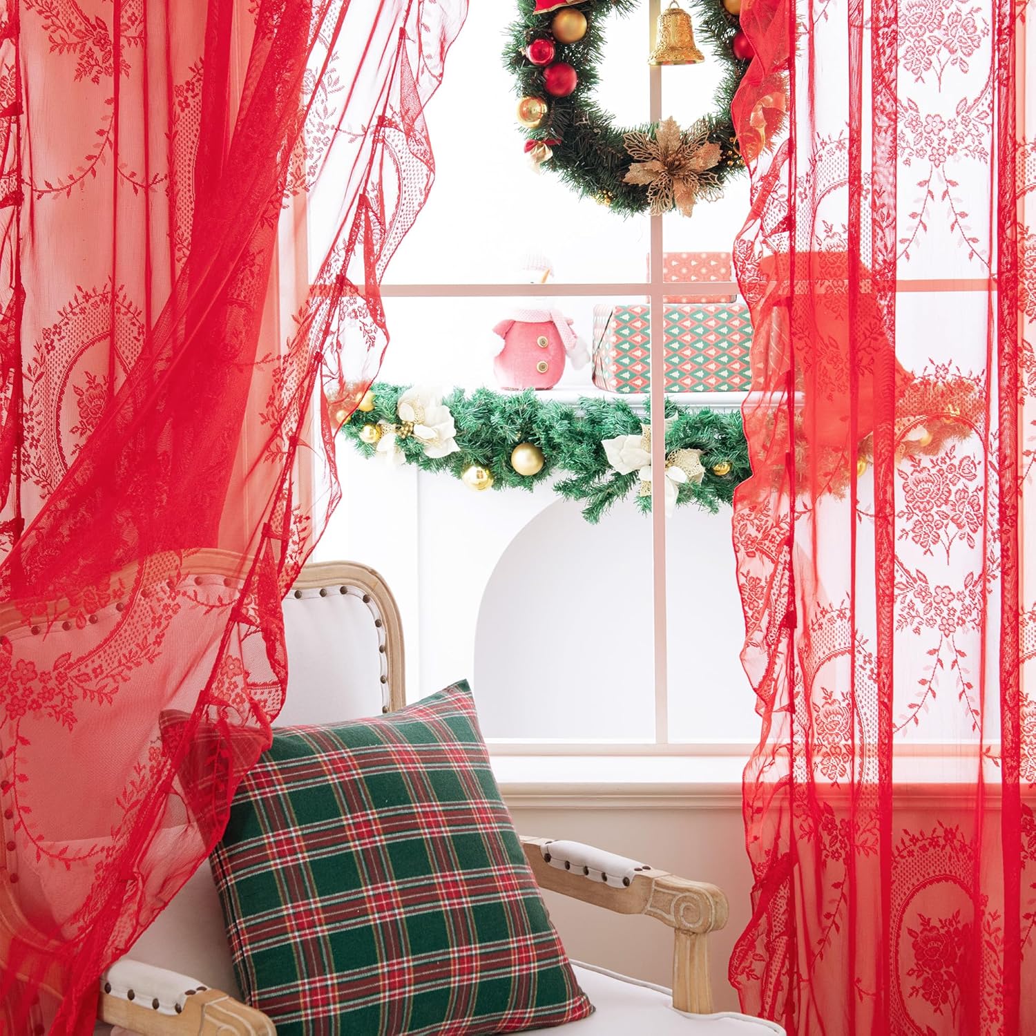 KYMRose Red Lace Curtains 95 inches long - 2 Panels Rose Floral Christmas Sheer Curtain, Rod Pocket Privacy Farmhouse Embroidery Curtains with Lace Edges for Living Room Bedroom 52 x 95 Inch