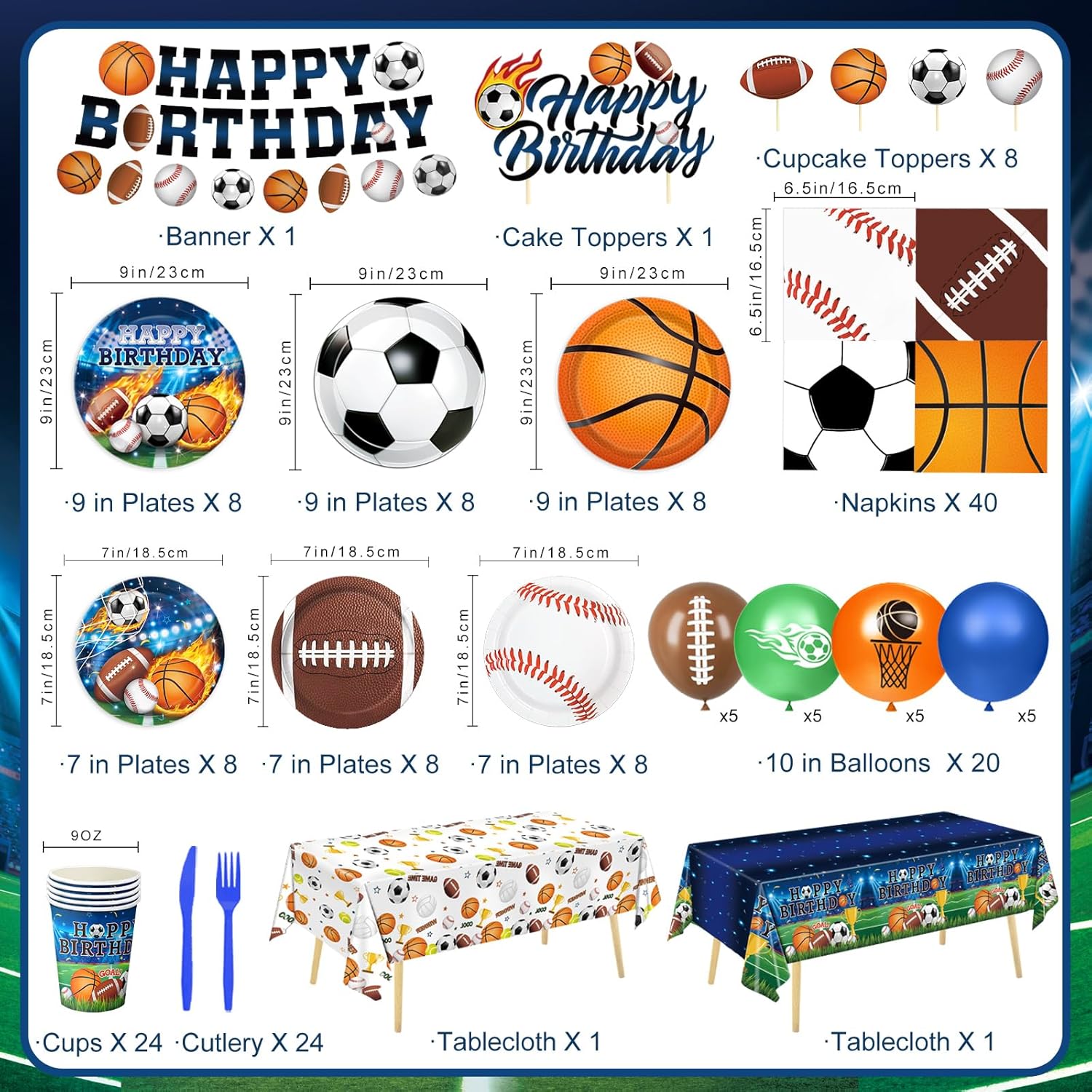 Features:The sports birthday party decorations are made of quality paper, heat-resistant, durable, odor-free, and fade-resistant. With exquisite patterns and vibrant colors, they provide an unforgettable sports party decorations experience.Description:Infused with the enchanting hues of sports party decorations, this thoughtfully designed party set promises to infuse joy into your event. Elevate your party celebration with decor that is not just an ensemble but a poetic masterpiece, casting an unforgettable charm across the festivities.Package Includes:24 x Plates (9 inches)24 x Plates (7 inches)24 x Napkins (in 2 designs)24 x Cups (in 2 designs)24 x Knives24 x Forks2 x Tablecloths (54 x 108 inches)1 x Banner24 x Balloons1 x Cake topper8 x Cupcake toppersPlease Note:There may be a slight size variation due to manual measurement.The color of the items may appear slightly different on different displays.