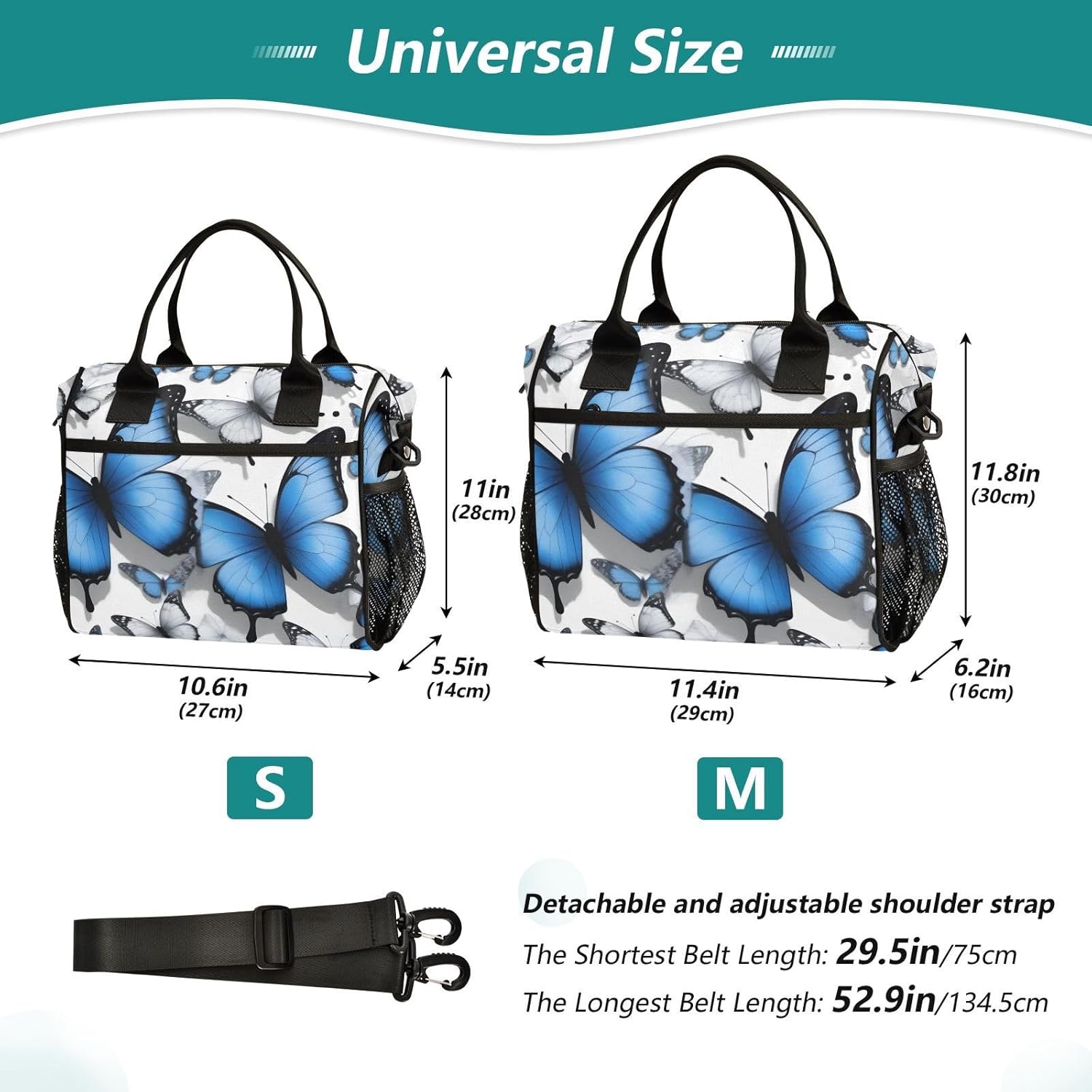 Product Details:Material:PolyesterSize:10.6x5.5x11In and 11.4x6.2x11.8InWeight:160gFeatures:Zipper closure + Top handle1.Superb Thermal Insulation: Premium Polyester exterior with a pearl cotton layer andquality aluminum foil lining ensures prolonged warmth retention and easy maintenance.2.Practical & Convenient Features: Detachable and adjustable shoulder strap, coupledwith a simple zipper closure, allows for hands-free portability and hassle-free access.3.Spacious Storage Capacity: The ample main compartment effortlessly fits various lunchcontainers, fruits, beverages, and snacks, catering to all-day needs.