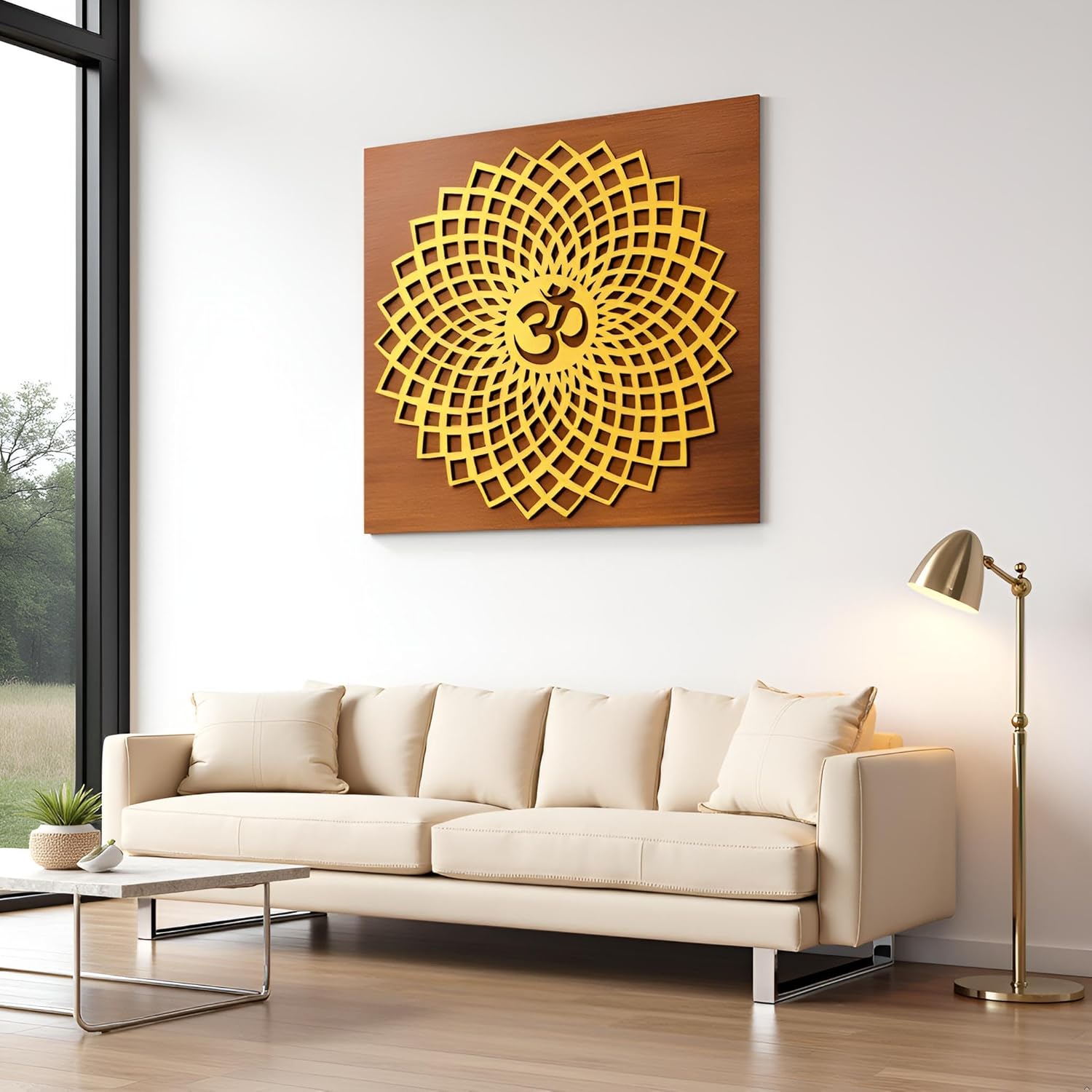 My Dream Carts Golden Om Round Decorative Wall Art Mdf Wooden Om Chakra For Temple, Living Room, Bedroom, Office, Hotel, Home Decor Items, Gift Item, Mandala Wall Hanging For House Decoration The OM Wall Hanging by My Dream Carts—a stunning masterpiece that embodies elegance and tranquility. Crafted with precision and attention to detail, this wall hanging is designed to bring a touch of serenity and positivity to any space. Specifications: Size: This OM Wall Hanging available in many sizes like 15X15 CM 20X20 CM 25X25 CM 30X30 CM 45x45 CM 60X60 CM Making it ideal sizes for various interior places. Material: My Dream Carts prioritizes quality, and this wall hanging is no exception. It is crafted using high-quality MDF wood (engineered wood) that ensures durability and longevity. Finishing: The OM Wall Hanging boasts a flawless laser-cut finish, showcasing intricate details that are sure to captivate the eye. Origin: This OM Wall Art is proudly made in India, a country renowned for its rich cultural heritage and artistic craftsmanship. Color: The OM Wall Hanging is adorned in a stunning golden hue, symbolizing richness, purity, and enlightenment. The golden color adds a touch of elegance and sophistication, making it a captivating focal point in any room. Versatility: The OM Wall Hanging by My Dream Carts is a versatile piece of art that complements various settings. Whether it's your living room, bedroom, meditation space, office, or any other area, this wall hanging effortlessly adds a touch of aesthetic allure.
