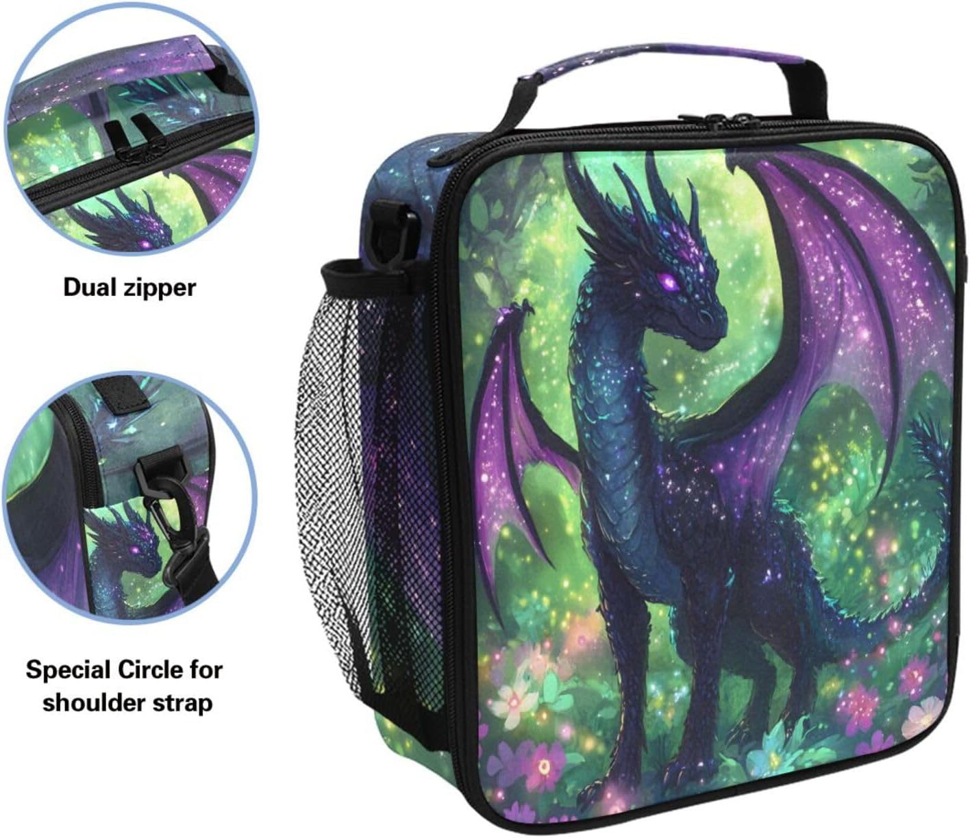 With the perfect size of 10.0" H x 9.0" W x 3.5" D, this lunch box offers a generous 6.5L of storage space, enough for kids' healthy lunch and drink. Its preservation time up to 6-8 hours for keeping foods or beverages fresh and warm/cold. Equipped with premium zippers and rip-resistant aluminum liner, this cute lunch box provide years of long-lasting, trouble-free using and are easy to clean. No rip or leaking issue will occur.Roomy Insulated Cooler Bag Offer 6.5L of Storage Space:--With the perfect size of 10.0" H x 9.0" W x 3.5" D, this insulated lunch bag tote can effortless offer you or your dear boys or girls a hearty lunch and drink for its generous 6.5L storage space.Preservation Time Up to 6-8 Hours for Keeping Foods or Beverages Fresh & Warm/Cold:--Using superior seamless one-piece aluminum lining and padding with 8mm EPE foam makes this lunch boxes for kids/women are with good insulation performance. It can greatly meet users' need of enjoying healthy and fresh foods.Rugged Exterior Fabric & Easy-to-Clean Liner:--Heavy-Duty 600D Polyester Oxford cloth canvas material in cute sloth cartoon pattern hides stain and resists tears. Fully wide open design and seamless one-piece aluminum lining make this insulated lunch box are easy to clean. Cleans up easily with soap and water.One Side Pocket for Water Bottle or Travel Coffee Mug & Inner Mesh Pocket for Napkin, Fork, Knife and Spoon etc.****Specifications****--Material: High density 600D durable anti-tearing 100% polyester & seamless one-piece aluminum liner--Dimensions: 10.0" H x 9.0" W x 3.5" D--Shoulder strap(adjustable/detachable): Min: 30.5 inch, Max: 50 inchManufacturer Minimum Age:3 years
