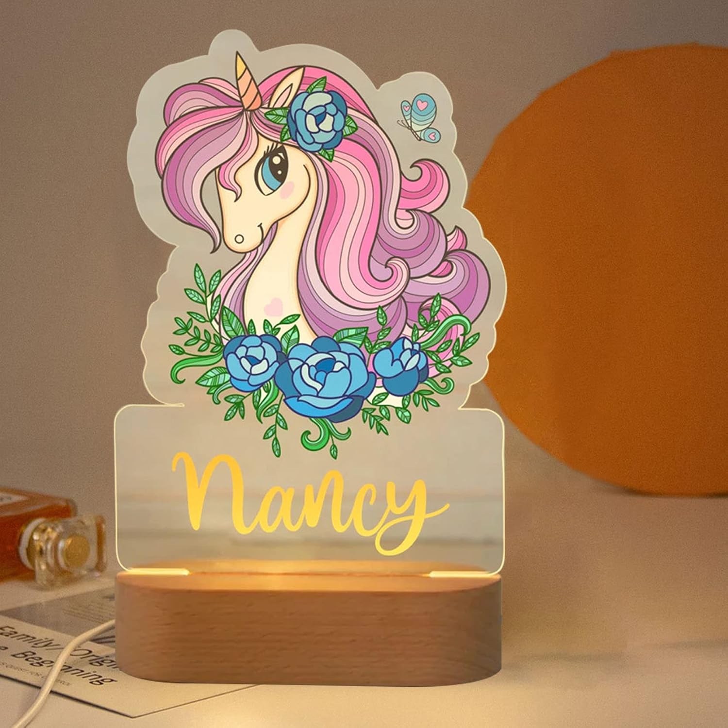 Fun night light for your little ones! The light is soft white to create a comforting and calm atmosphere. It will help your children to feel relaxed and safe at night time, to help them fall asleep quickly. DETAILS: ~ Laser engraved acrylic ~ Base - solid beech wood ~ USB cord with On & Off switch ~ Soft white light We engrave the any text the night light so it's there forever - the name will never peel - rub or fade away