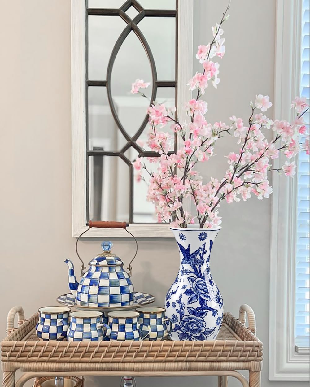 A Classic Reimagined for Modern Homes Inspired by traditional Chinese blue and white porcelain, these blue and white chinoiserie vases blend heritage craftsmanship with contemporary home styling. The detailed floral artwork and balanced silhouette create a large chinoiserie vase that feels both antique and fresh—perfect for today’s interiors. Handcrafted Beauty You Can See & Feel Each blue and white vases for flowers is hand-painted and kiln-fired, giving it depth, texture, and character that mass-produced décor simply can’t replicate. The glossy porcelain vase finish enhances the intricate patterns and adds a luxurious touch to any room. Blue and White Vases for Centerpieces is Designed to Elevate Any Space Blue chinoiserie vase is perfect for living room centerpiece Blue floral vase can be use for entryway statement piece Blue ceramic vase works for dining table accent Chinoiserie flower vase is great for shelf or mantel décor Blue and white floral vase is perfect for fresh or faux flowers This large blue and white vase instantly transforms empty surfaces into styled spaces. A Gift That Feels Thoughtful & Timeless Unlike trendy décor that fades quickly, this vintage blue and white porcelain vase offers lasting beauty. Our blue and white vases are the ideal gift for: Housewarmings Weddings & anniversaries Holidays Art & décor lovers A blue chinoiserie vase that feels collected, not mass-produced. Why Customers Love This Blue and White Chinoiserie Decor? Authentic chinoiserie vase design Large 11” statement size Hand-painted porcelain craftsmanship Works with or without flowers Complements modern & classic interiors Timeless blue and white colorway If you’re looking for a blue white flower vase that feels elegant, meaningful, and truly special — this blue ceramic vase is the one.