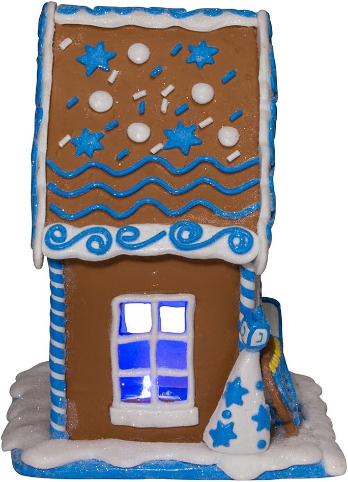 Add a sweet touch to any Christmas or Hanukkah decor with this 7-inch LED Hanukkah gingerbread house table piece from Kurt Adler! this unique gingerbread house table piece is decorated in white and blue, and features the star of David, Dreidels, and a menorah - perfect for celebrating Hanukkah or even Christmas in households that celebrate both! at the flip of a switch, this table piece lights up from with LED lighting