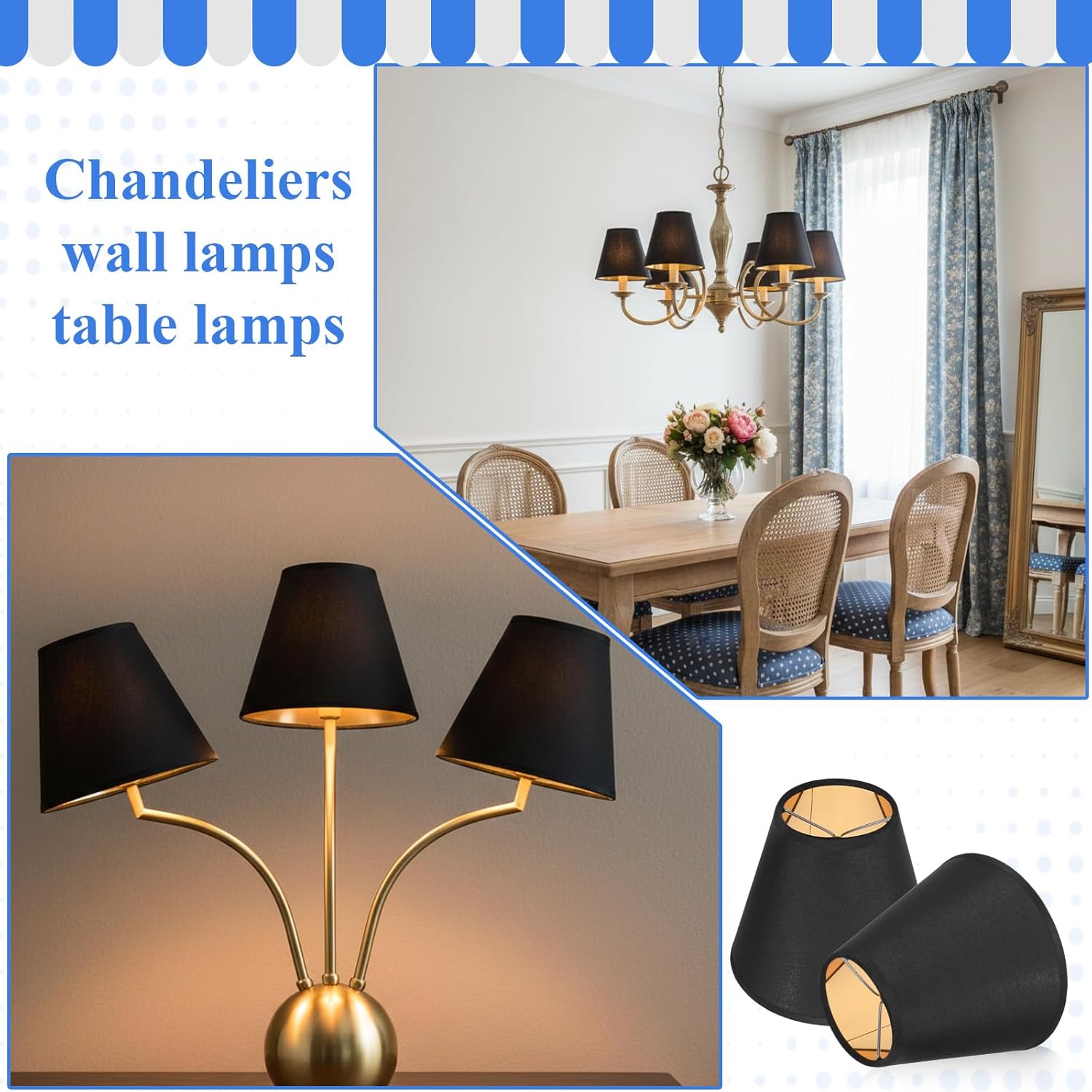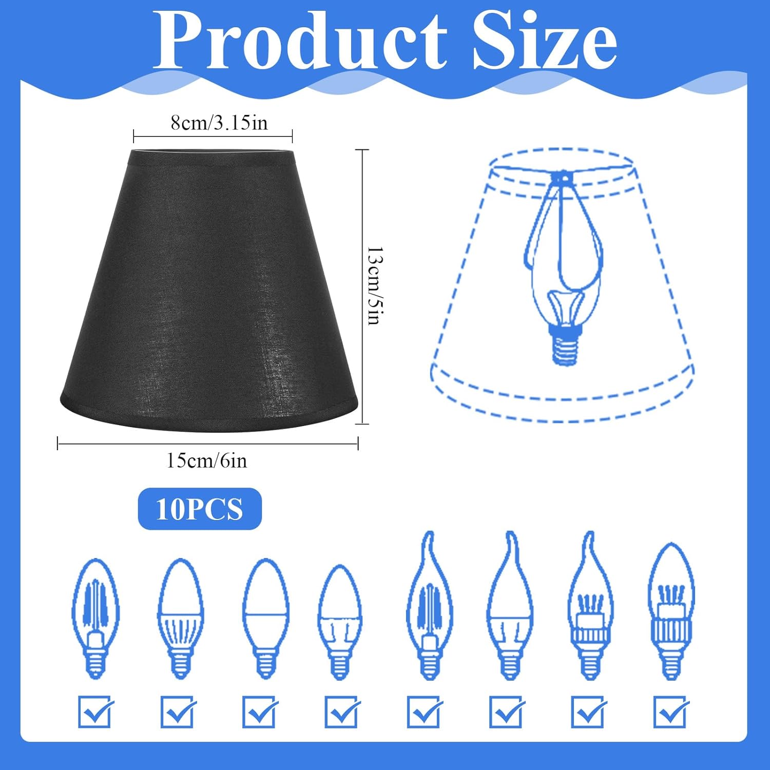 Package Includes: 10 black Barrel Fabric Lampshade CoversProduct Name: Clip-on Small Lamp ShadeMaterial: FabricColor: BlackWeight (g): 1000Dimensions (cm): The small black lamp shade is approximately 3.15 inches in upper diameter, approximately 6 inches in bottom diameter, and approximately 5 inches in height.