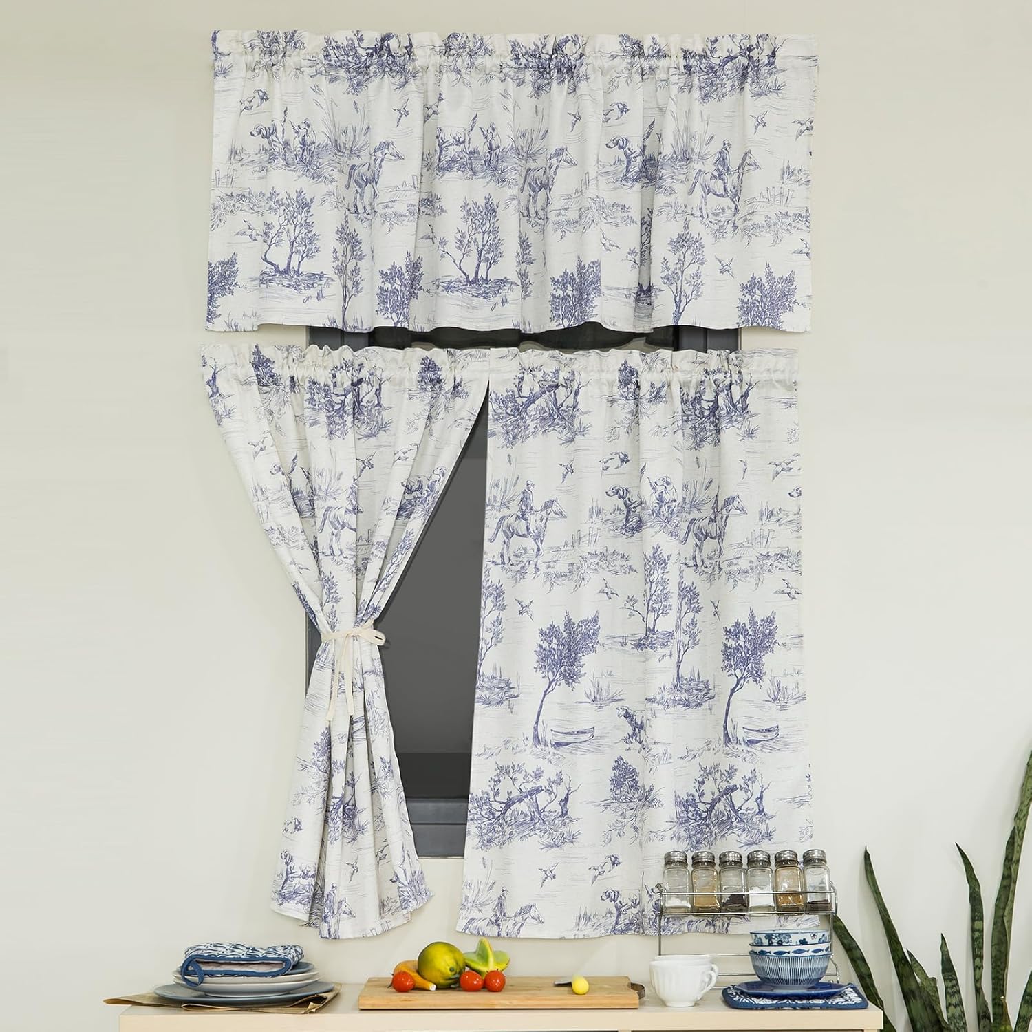 Classic french blue toile de jouy style.Linen-blend material with comfortable touching.Digital printing technology bring the design to life.The design material comes from the 17th century French rural hunting scenery,pretty match your farmhouse decoration,release unique elegance and natural style. Gentle and natural visual effect and touch feel which make the curtains elegant and comfy that can enhance the kitchen atmosphere obviously. Additionally,it can filters the outdoor light and keep your privacy while giving you the right and comfy light environment. And there are exquisite rope tieback which can help you tie the curtains up conveniently.