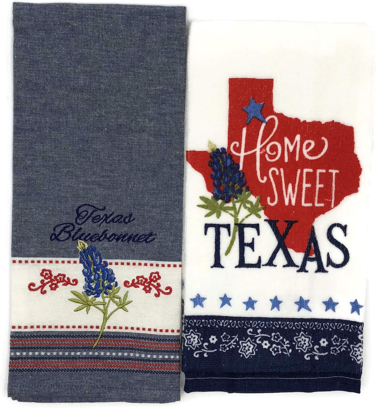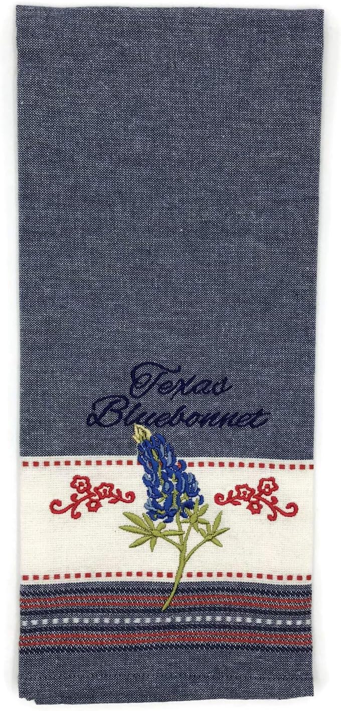 100% Cotton Imported Tea towel features an embroidered Texas state flower, the bluebonnet. Terry towel printed with bluebonnets & Texas state outline Cotton loops in the weave make terry towels absorbent and fast drying