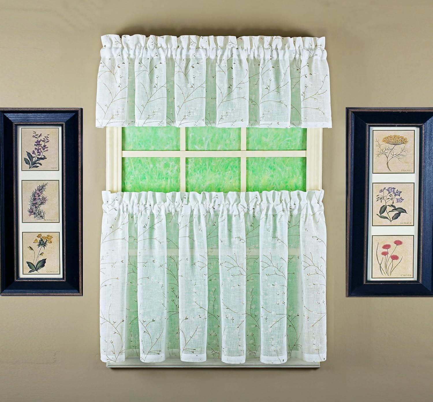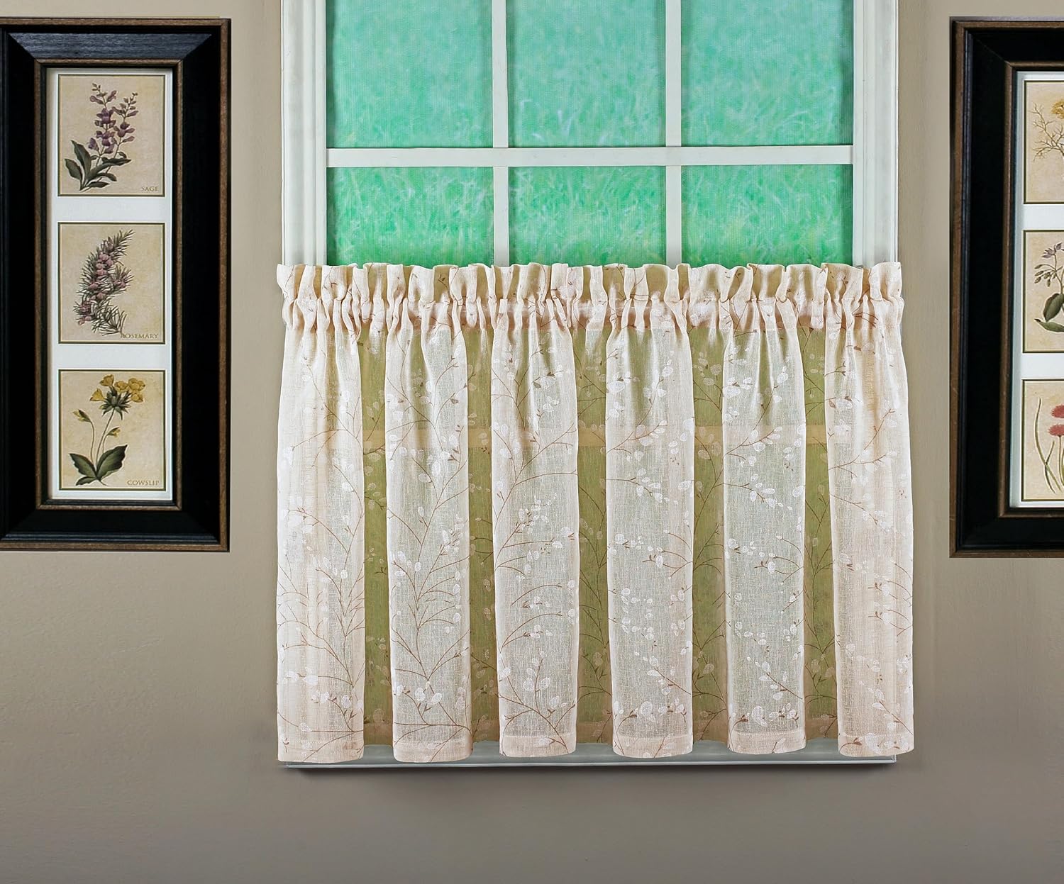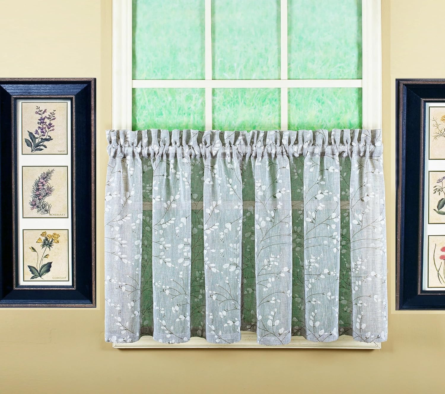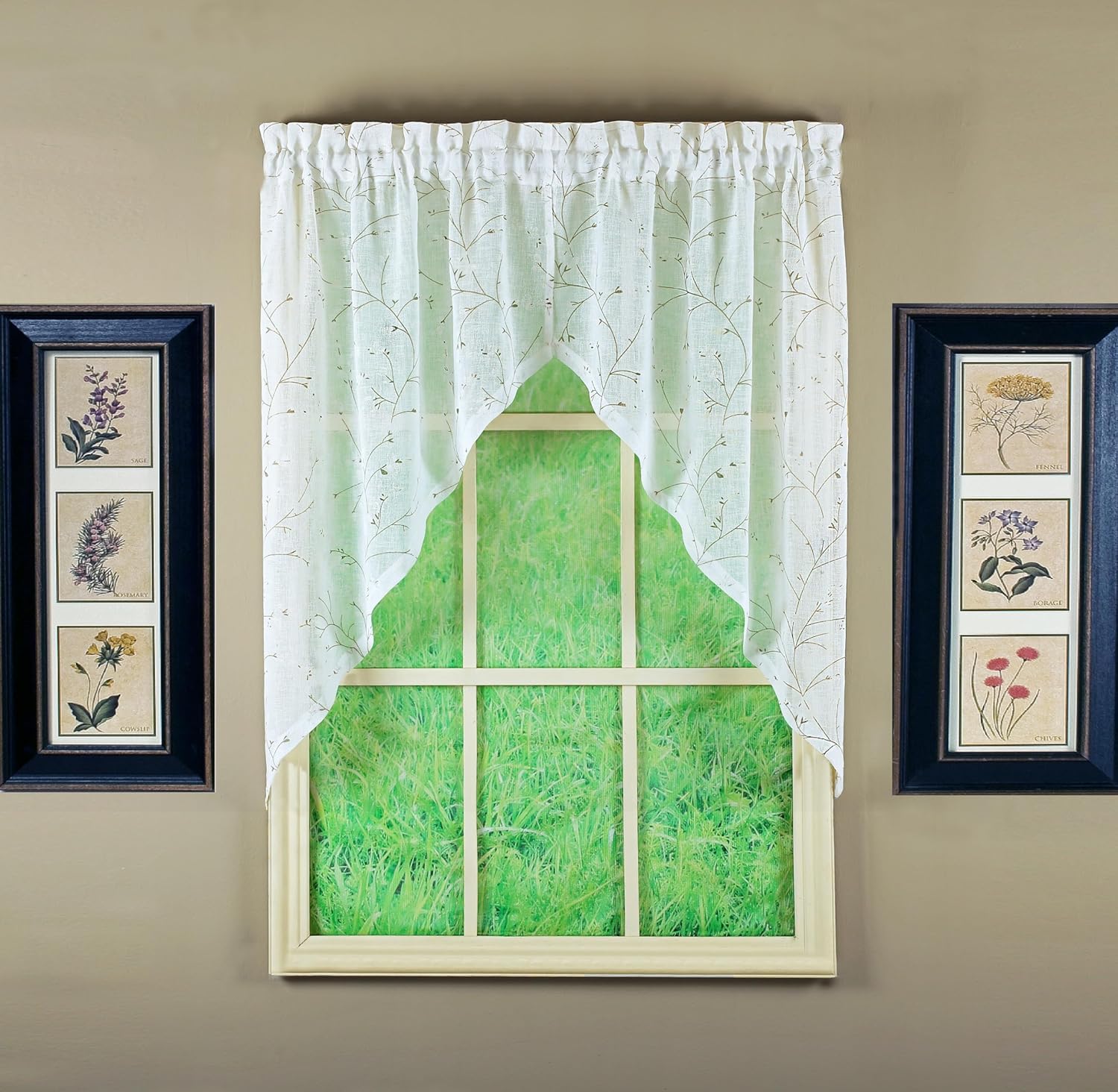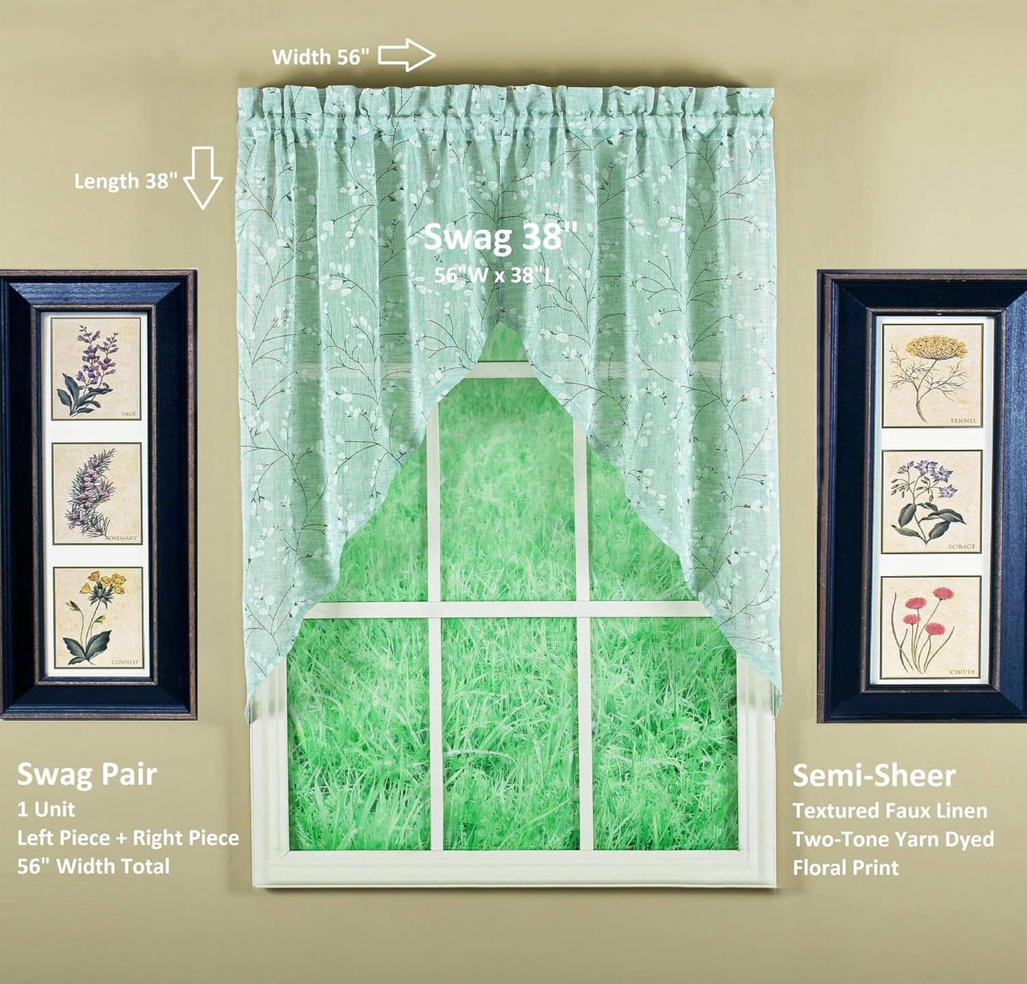 Slub textured faux linen fabric, woven by 2-tone yarn dyed, a rich textue fabric, features 2-tone printed motif of scrolling branches and blossoms all over the entire curtain, allowing light filtering and still providing privacy. Available in Swag Pair 38", Tier Pair 24" and 36", Straight Valance 12", Panel 63" and 84", and Scallop Valance 18" as well, for all your home window decor. For a wider window in a swag style, add one or more units of Straight Valance 12" as insert.