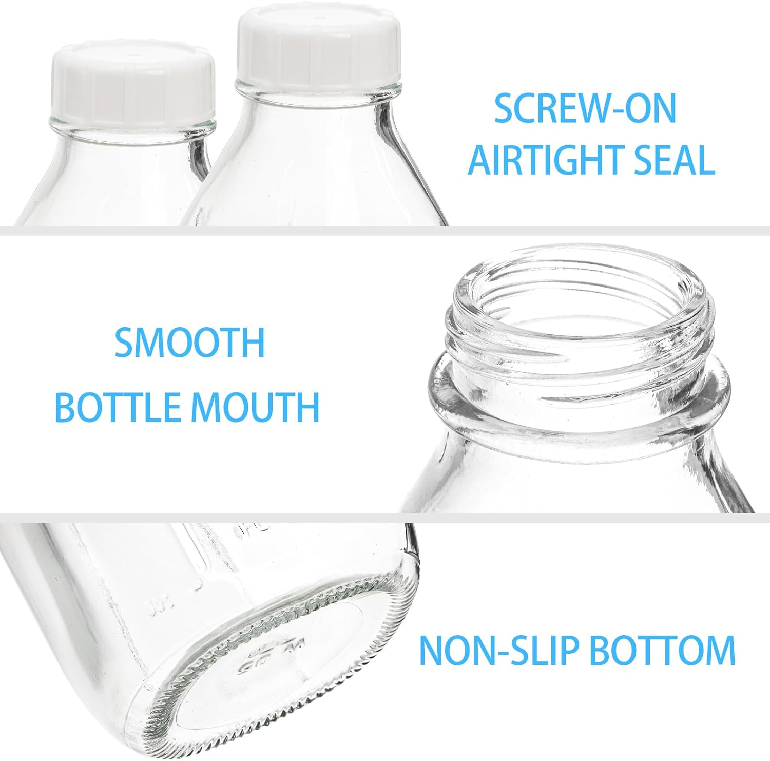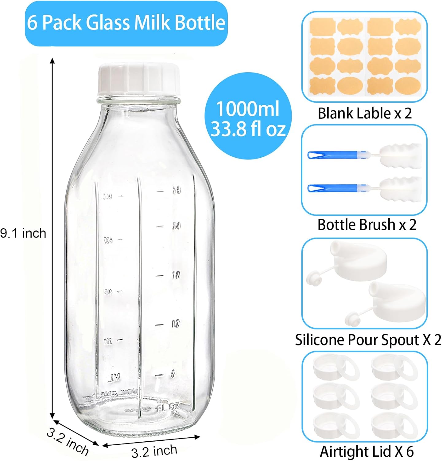 | Included Components | 6 Pack Glass Milk Bottles, 6 Pcs Airtight Screw Lids, 2 Pcs Pour Spout, 2 Pcs Labels, 2 Pcs Bottle Brushes |