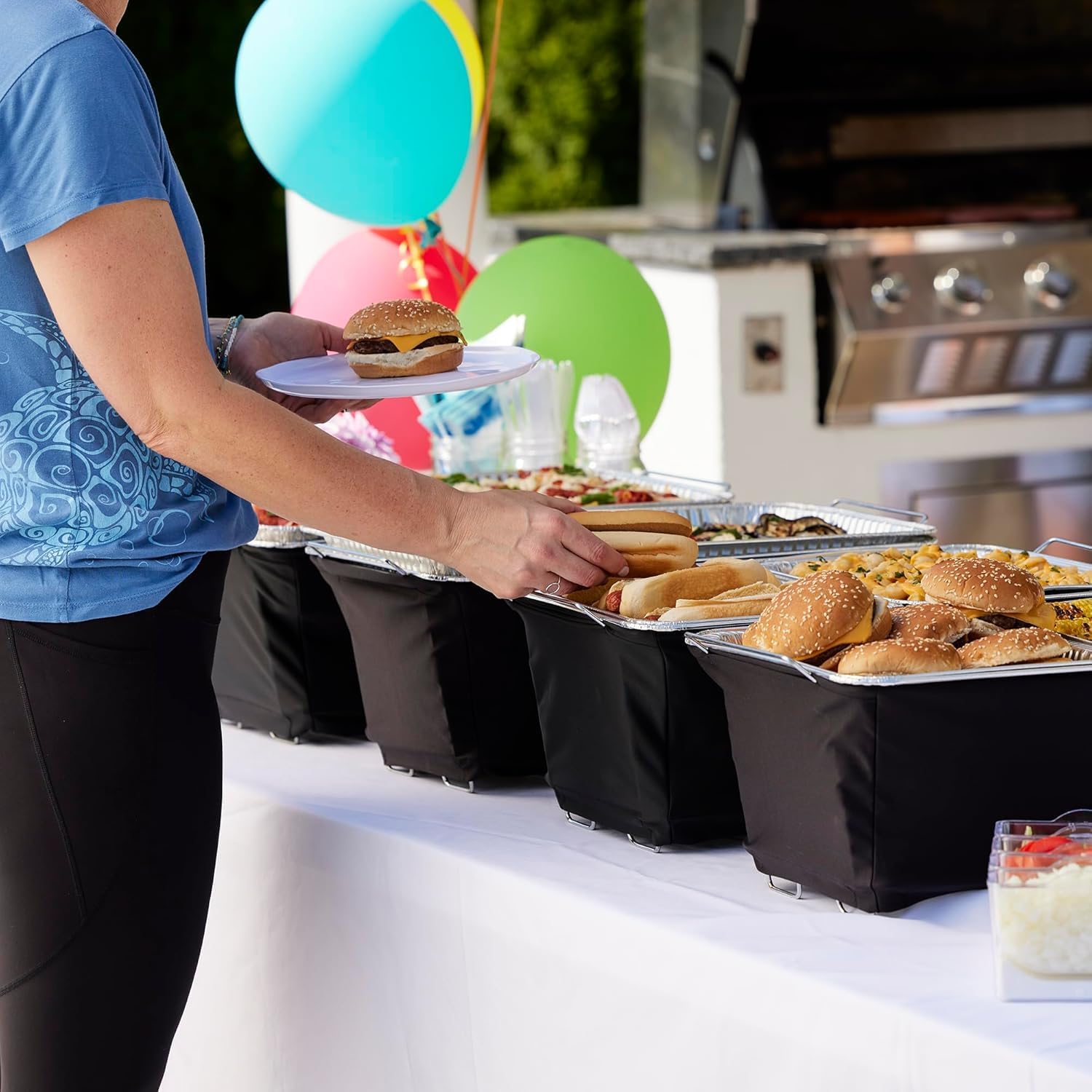 Elevate your buffet presentation with the Chef-Master wind guard for chafing dishes, the professional solution for maintaining perfect food temperature in any environment. This 4-pack of premium wind guards is specifically designed for wire chafing racks, buffet servers, and food warmers, creating a protective barrier that blocks air while retaining heat. Crafted from high-quality flame-retardant fabric, these wind guards offer both safety and functionality around chafing fuel. The stretchable material provides a secure fit over standard chafing dish frames, while the convenient hook and loop closure system allows for quick access to fuel without disrupting your buffet setup. Perfect for both indoor and outdoor use, these chafer covers excel in various settings from elegant weddings and corporate events to casual backyard parties and camping trips. The wind guards effectively shield flames from drafts while maintaining ideal serving temperatures for your culinary creations. Setup is completely tool-free, with built-in hand protection features that make installation safe and efficient. The durable construction ensures these wind guards will be a lasting addition to your catering supplies or home entertaining collection. Whether you're a professional caterer or a dedicated host, these chafer wind guards provide the reliable performance needed for successful food service. Keep your dishes at the perfect temperature, protect your presentation from environmental factors, and ensure your guests enjoy warm, delicious food throughout your event. chafer dish,black chafing dishes for buffet,chafing rack,chafing dish covers,chafing stand,chafing dish cover,chafer wind guard 6 pack,chafing stands for buffet,wire racks for chafing dishes buffet,racks for food warmer,cold chafing dishes for buffet,wire chafing dish