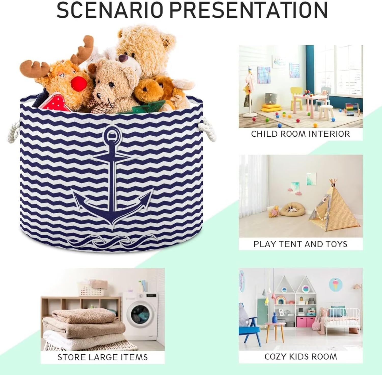 Anchors Print Large round storage basket with design sense can be used as a home decoration or organization tools. Sleek and minimalist design effortlessly blends with any interior decor. Anchors Storage basket is suitable for playroom, laundry room, balcony, toilet, corridor, cloakroom, kitchen, bedroom, bathroom, living room, closet, car, etc