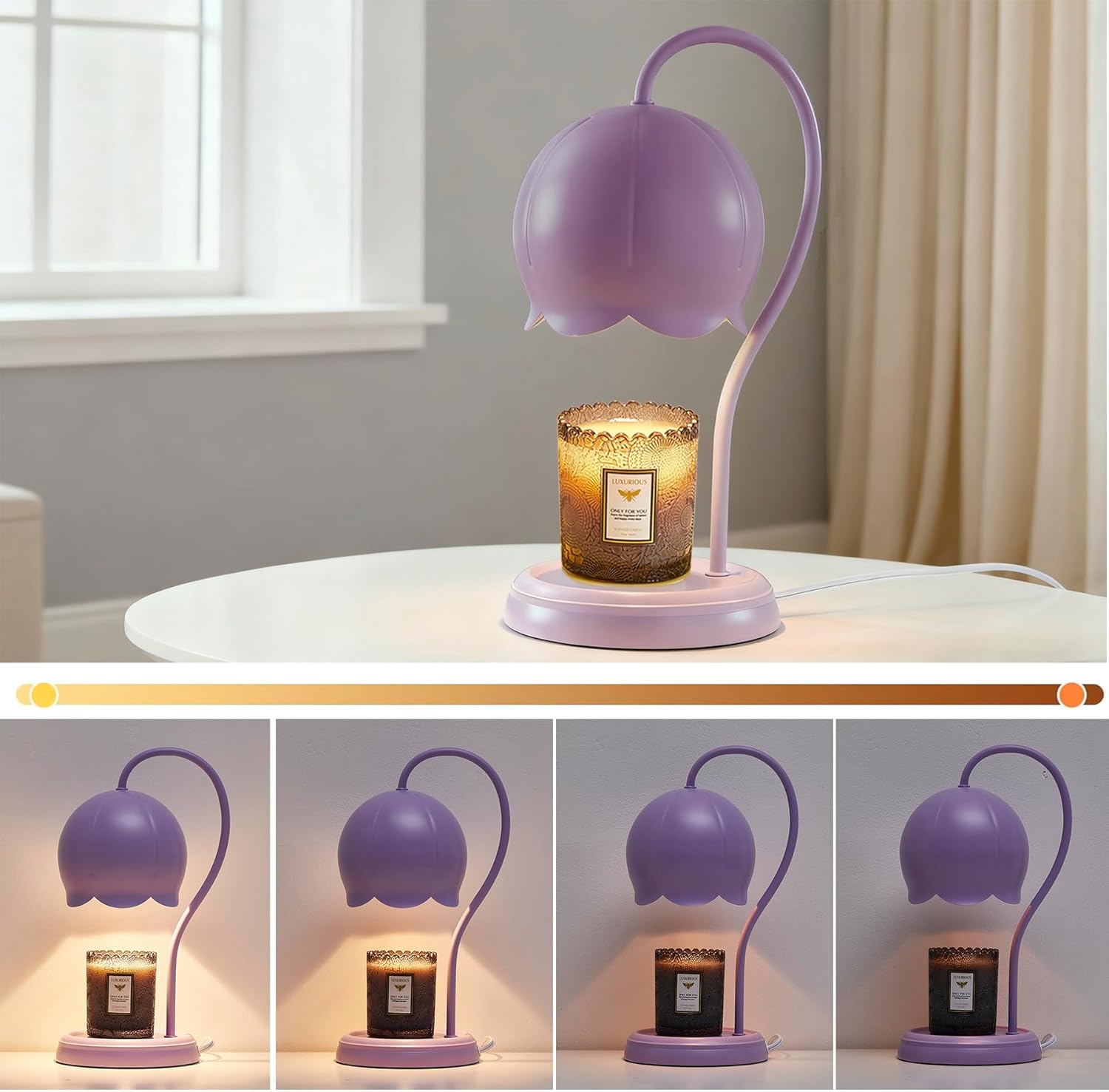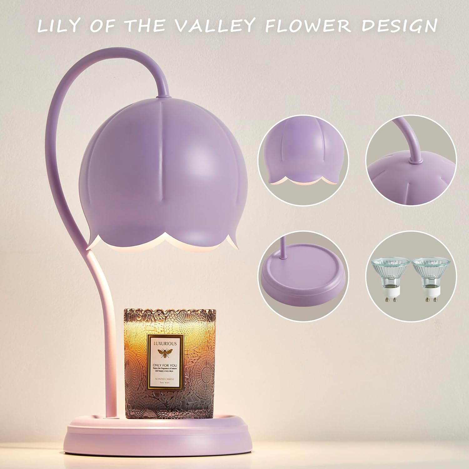 Looking for a cute lamp that combines style, functionality, and versatility? This candle warmer lamp is the perfect gift for birthdays, Christmas, anniversaries, or housewarming parties. Bring warmth and style into any space with this flower candle warmer lamp. Product Feature: This flower-shape candle warmer lamp not only serves as an elegant piece of decor but also adds a warm ambiance to any room. Whether it's your bedroom, living room, or office, this lamp will be a beautiful focal point and a perfect addition to your cozy home decor. Designed with a large size, it is compatible with various candle types, including jar candles, pillar candles, and wax melts, offering flexibility for your favorite scents. With this electric candle warmer, you can enjoy the benefits of a flameless experience, making it a safer option, especially for homes with kids and pets. Plus, the built-in timer function allows you to set an automatic shut-off, giving you peace of mind when you're not around. The dimmable light feature lets you adjust the brightness to suit any occasion, from a soft, relaxing glow to a brighter light for reading. Whether you’re unwinding after a long day or enhancing the mood, this dimmable candle warmer lamp is perfect for creating the right atmosphere. Energy efficiency is key! You can leave this energy-efficient candle warmer on for hours without worrying about high electricity bills. It not only provides long-lasting light but also works with wax melts to fill your space with soothing fragrances. Package Includes: 1x Candle warmer lamp 2x Bulbs 1x Manual Please note candles are not included!!!