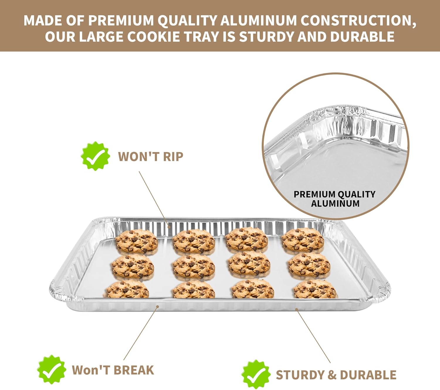 24 Pack Aluminum Disposable Cookie Sheets for Baking and Roasting 16 x 11 inch Disposable Aluminum Foil Grilling Pans for Brownie Tins,Cooking Thin, Coffee Cakes, Oven Liners. Disposable Aluminum Cookie Sheets Feature:. - Made from aluminum foil. - Stackable for Convenient Storage. - The flat bottoms encourage even baking and reheating. - Oven and freezer safe. - Aluminum disposable cookie sheets for baking, Great for all types of food prepping, baking, cooking, roasting,bake bread, quiches, lasagna, cake etc. - Suitable for all occasions, weddings, parties, dinners, fine dining and families. - If you run a catering business or restaurant, these foil pans can also be handy for storing take-out food. Material: Aluminum foil Color: Sliver Size: 16.61 inch x 11.73 inch x 0.86 inch Quantity: 24 pcs Package includes: 40 x Aluminum Cookie Sheets for Baking
