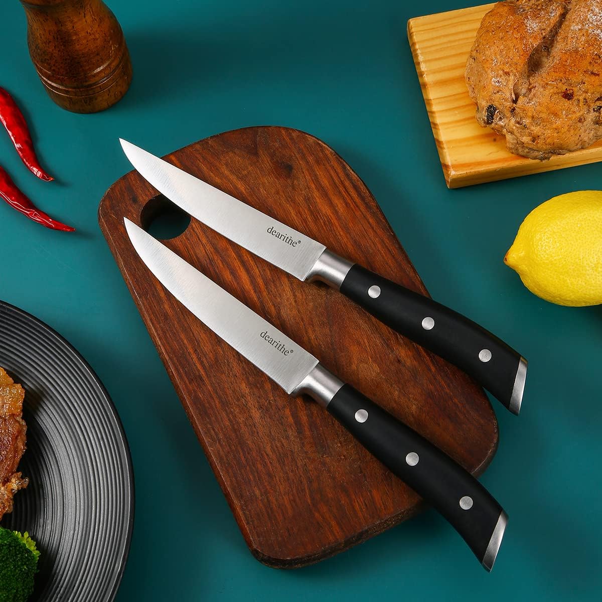 This 6 piece steak knives ,5 inches blade, Crafted in high carbon stainless steel, durable and sharp; 4.6 inches handle, is made of stainless steel and ABS.