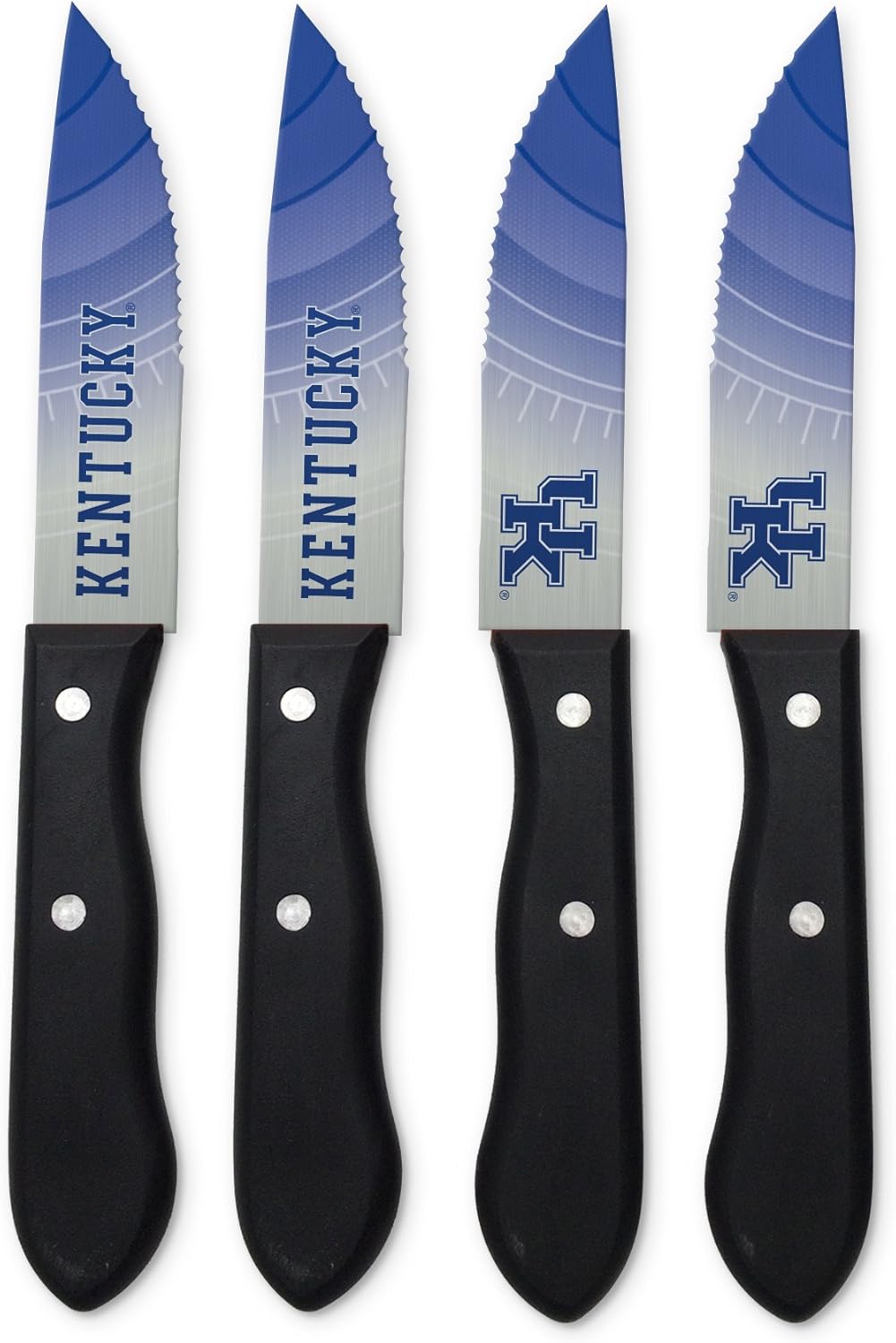 That first cut into a juicy steak that's cooked perfectly medium rare and that initial bite of flavor goodness. Mmmmmmm!!! Now you can experience all of that meaty goodness while supporting your favorite team with this set of 4 serrated stainless steel steak knives from The Sports Vault. Each knife is approximately 9.5-Inches long with a 5-Inch blade and features custom team artwork on each side. You don't win friends with salad but these knives will surely lend yourself to moving up the ranks with your friends and family. Perfect for homegating, tailgating or bbq's and to celebrate your game night victory