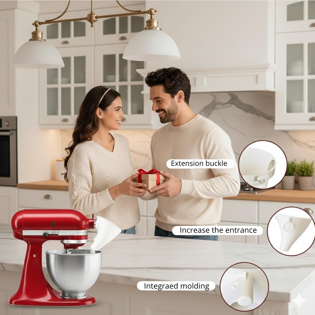 Make baking clean, easy, and fun with the LUNMASH Baking Funnel. Perfect for pouring flour, sugar, cocoa, milk, eggs, and more directly into your bowl without spills or mess. Its hands-free design lets you add ingredients gradually while mixing, making every recipe smoother and stress-free. Safe for kids to help, durable BPA-free plastic, and dishwasher safe for eVortless cleanup. A thoughtful gift for home bakers, moms, and families. Bake cleaner, faster, and happier with LUNMASH. All the advantages at a glance: ☑ 1- Mess-Free Pouring: Guides flour, sugar, cocoa, milk, eggs, and liquids directly into the bowl without spills. ☑ 2- Hands-Free Design: Holds itself in place for smooth, stress-free ingredient adding while mixing.☑ 3- Safe for Kids: Lets children safely help bake, keeping their hands away from moving parts. ☑ 4- Durable Material: Made from BPA-free, food-grade plastic built to last daily use. ☑ 5- Easy to Clean: Dishwasher safe or quick rinse for eVortless cleanup.☑ 6- Perfect Gift: Ideal for moms, wives, and home bakers who love baking. ☑ 7- Time-Saving & EVicient: Keeps the kitchen clean, reduces waste, and speeds up baking. ☑ 8- Family Fun: Turns baking into an enjoyable activity for everyone, creating lasting memories. How to Use the Baking Funnel: Attach the Funnel: Place the funnel securely on top of your mixing bowl. Add Ingredients: Pour flour, sugar, cocoa, milk, eggs, or other ingredients into the funnel. Mix Safely: Let the funnel guide the ingredients while mixing hands-free and mess-free. Clean After Use: Remove the funnel and rinse it or place it in the dishwasher for easy cleanup. With these simple steps, you can bake eViciently, keep your kitchen clean, and enjoy a stress-free cooking experience.Technical Data: Product Name: 7 quarts Flour Funnel for Kitchen MixerMaterial: Acrylonitrile Butadiene StyreneColor: WhiteDimensions: Approx. 12× 16 × 15 cmWeight: Approx. 125.6 g“Bake cleaner, faster, and happier—make every kitchen moment a joy with the Baking Funnel!”