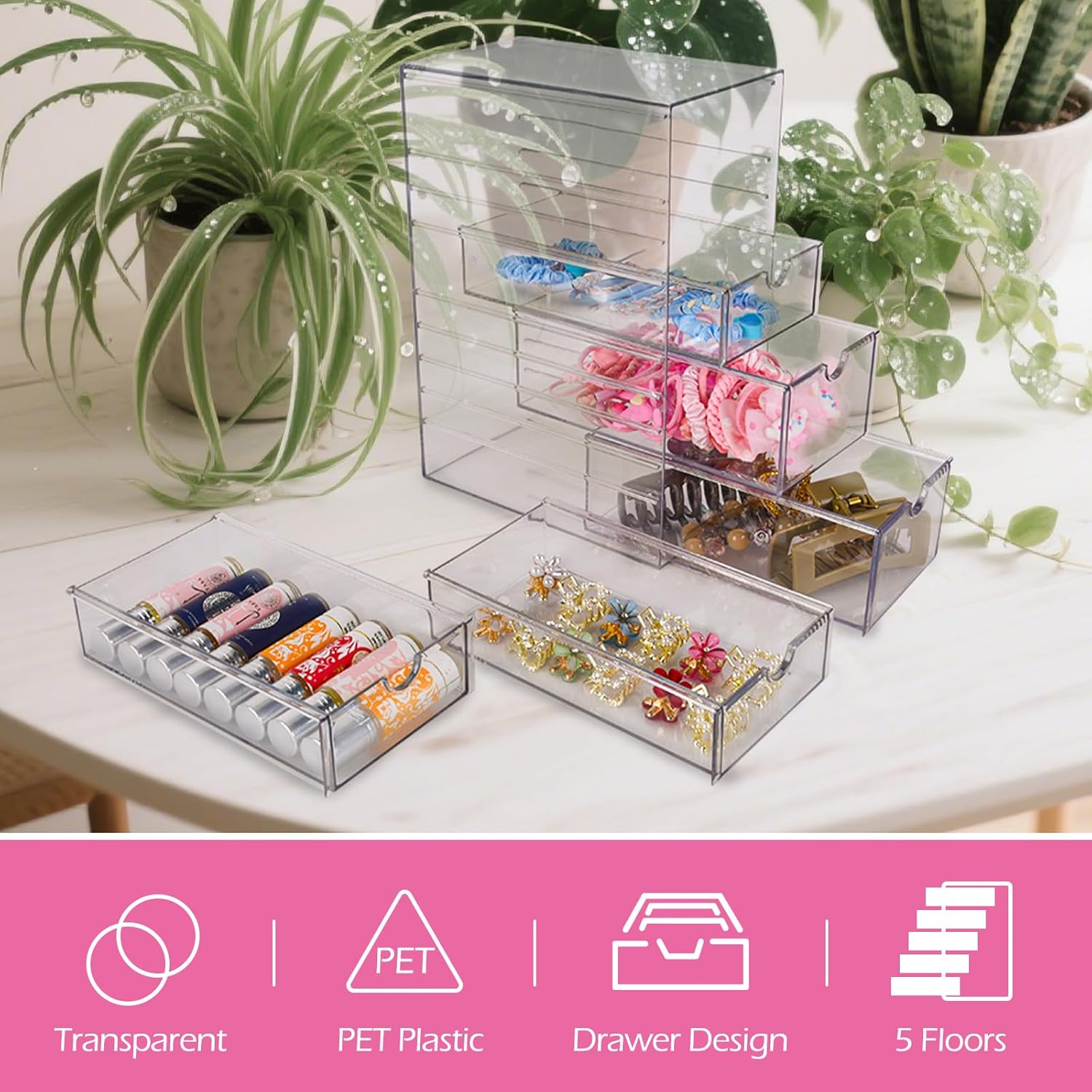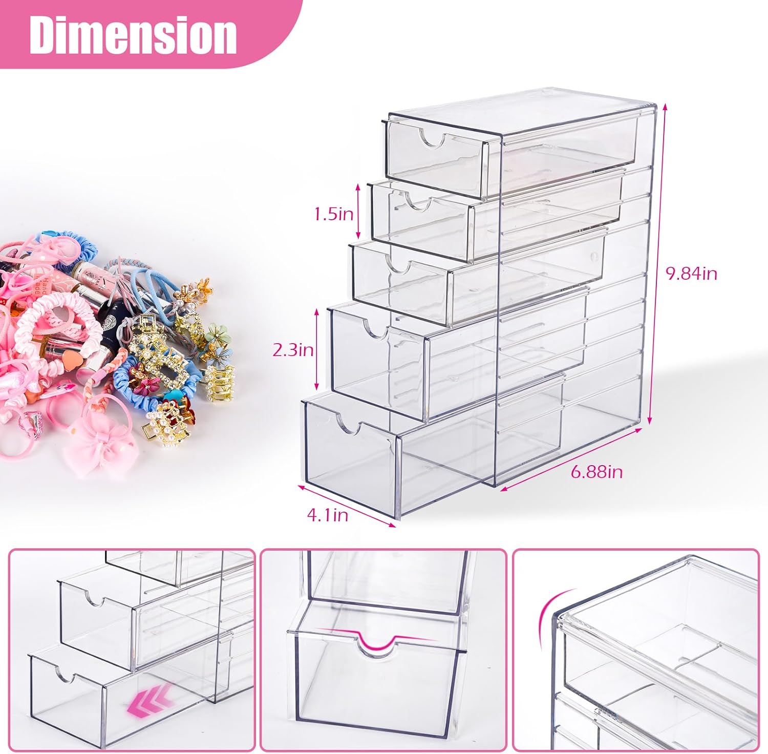 Hair Product Organizer Usage scenario: Clear durable plastic organizer containers for scrunchie, hair tie, hair clip, hair accessories, jewelr organization. Hair Tie Holder. Hair Accessories Organizer. Clear Hair Organizer Storage Box. Hair Tie Storage Organization. This Clear Drawer Organizer is a premium and well-crafted storage solution. Its premium materials and fine workmanship ensure durability and longevity. The organizer's ideal dimensions provide ample space for your hair accessaries. Clear Containers for Hair Accessory Organizing Plastic Hair Accessory Organizer Box with 5 Drawers Widely used: Girls' hair accessories organizer is used in the bathroom, office, closet or anywhere else you need extra organization. Its design and size make it ideal for storing a variety of small items, such as jewelry, watches, or cosmetics. The user-friendly design keeps your hair accessories organized on the makeup table while making your counter cleaner. Neat storage drawers with clearly visible items can save you space to choose hair accessories. The unique transparent appearance creates a charming display that every woman will fall in love with at first sight! It's easy to find what you need without opening a drawer. The gift of love for you: The unique transparent look creates a charming display that every woman will fall in love with at first sight! The perfect gift choice for stylish girls on Valentine's Day, Christmas, birthday, anniversary or any special day! Display your beautiful hair accessories: The design has a transparent shell, you can store your everyday items in this box for easy viewing and access, allowing you to find your favorite hair accessories at a glance, saving you time and happy to start the day.