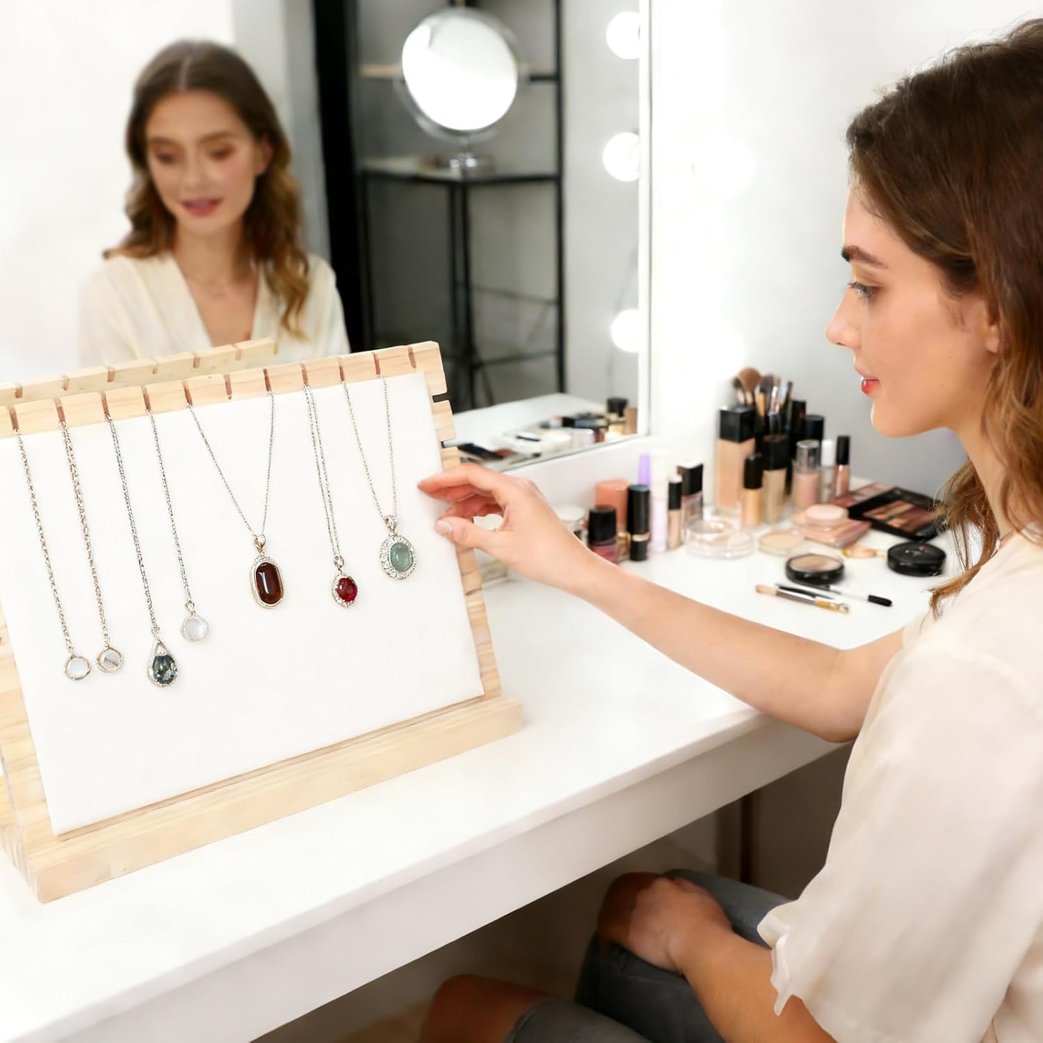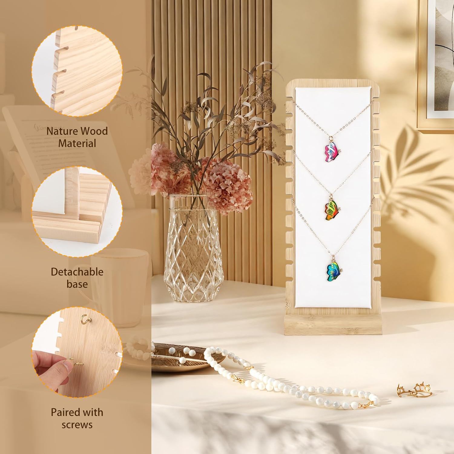 Display your necklaces with elegance and ease using this versatile 4-piece wood display stand set. Perfect for jewelry sellers, collectors, and home organizers, these beige-finished stands are crafted from solid wood and feature a timeless rustic design that beautifully complements any necklace, chain, or pendant. The set includes two different sizes,each fitted with sawtooth slots to keep jewelry secure, tangle-free, and ready to view. With a tool-free removable base, setup is quick and simple. Just slide the display board into the slot, and you're ready to showcase your pieces. This practical design makes it easy to transport and reposition the stands, whether you're organizing at home, setting up at a craft fair, or stocking a retail display. Ideal for jewelry stores, boutiques, markets, trade shows, or personal use, these stands help you present necklaces professionally while keeping them organized and protected. Use them to style photos, enhance home decor, or attract customers with a clean, attractive presentation.