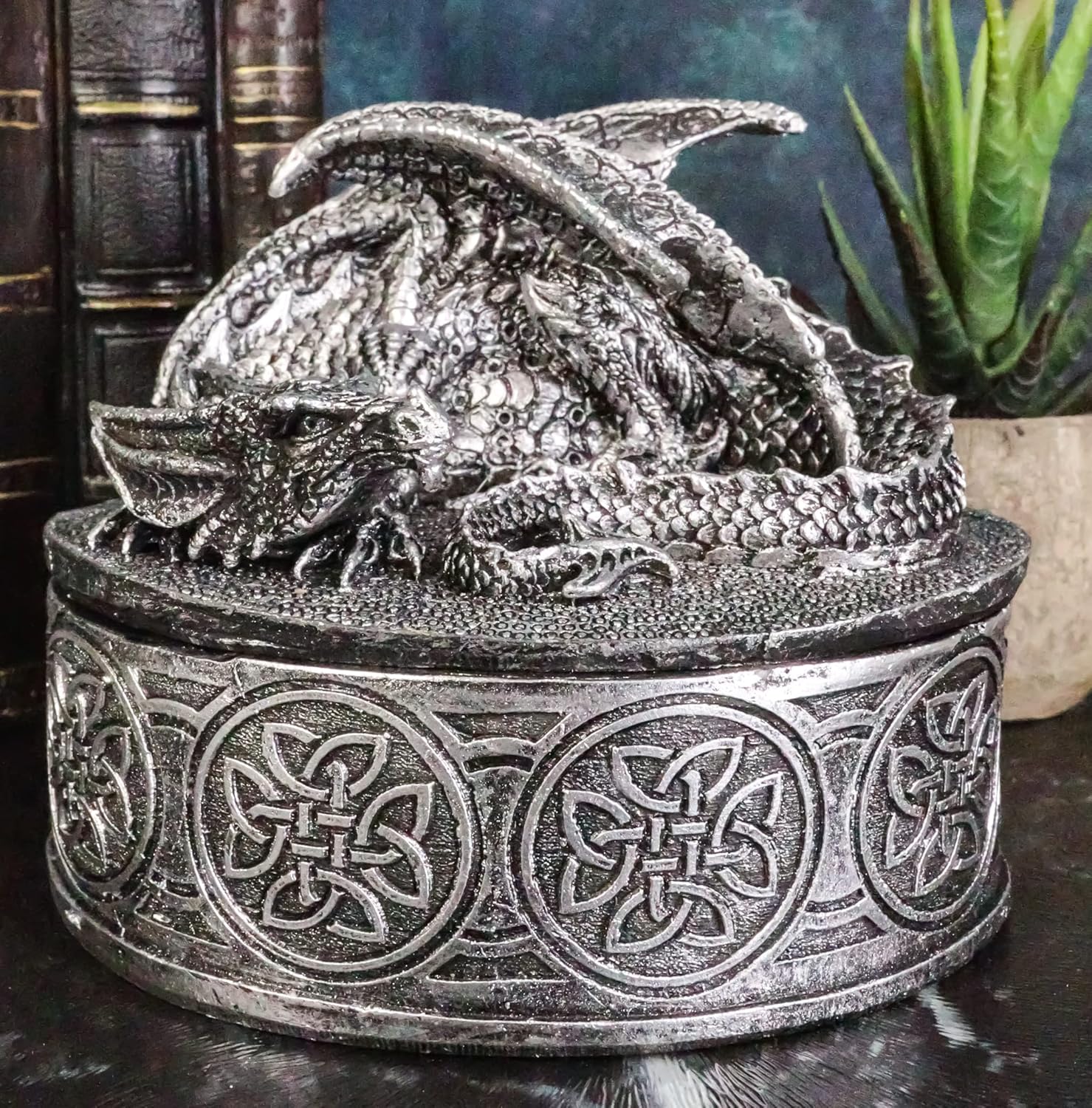 This Sleeping Dragon Oval Box measures approximately 4.75" tall, 4" long and 3.5" wide. This Sleeping Dragon Oval Box is made of high quality polyresin, hand painted and polished individually. Color tone may vary from pictures. This is a decorative box for keepsakes, jewelry, and other knick knacks. The sleeping dragon is in slumber, guarding an oval shaped celtic treasure box beneath him. Don't wake him up as he is the most gruesome dragon on earth!