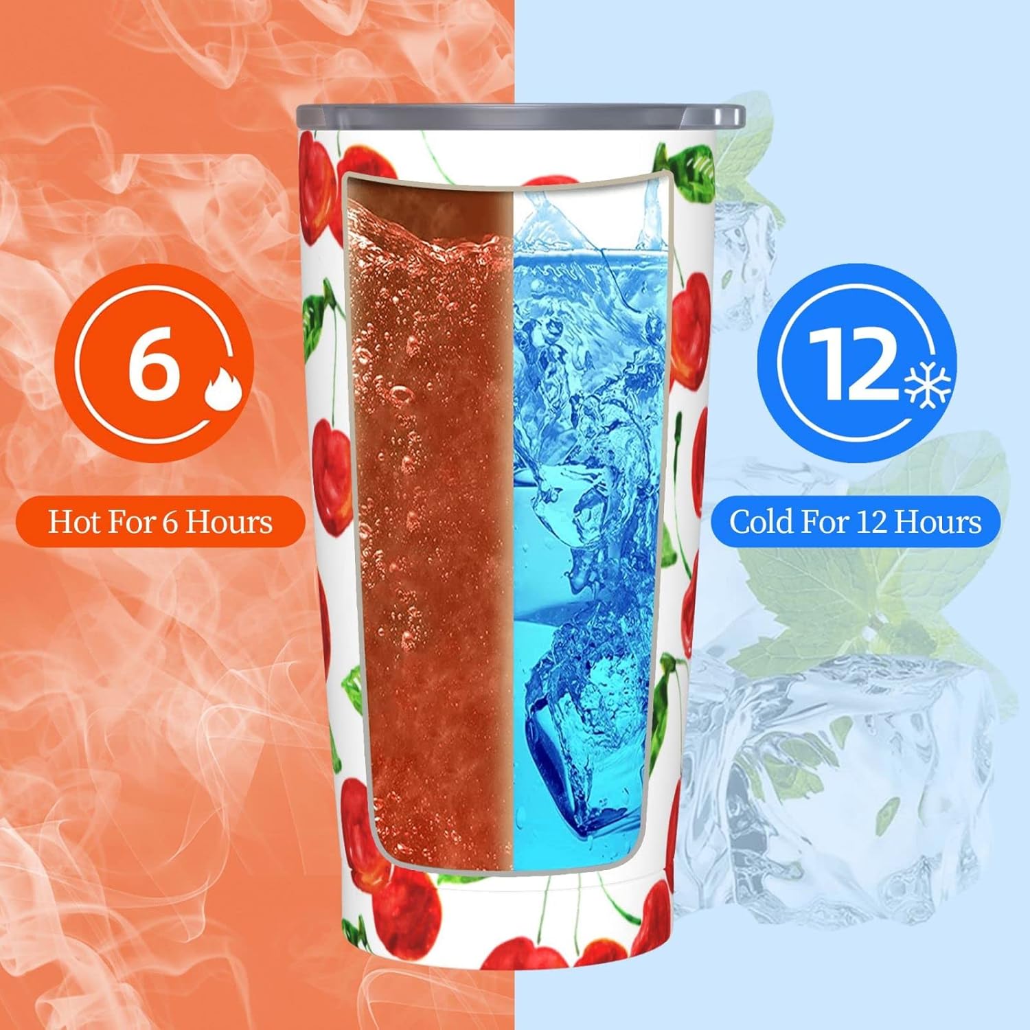 Dujie 20oz Tumbler with Lid and Straw, Sweet Red Cherry Vacuum Insulated Iced Coffee Mug Reusable Travel Cup Stainless Steel Water BottleThank you for visiting Decai Store! Various patterns on the vacuum insulated tumblers are originally designed in different styles by Dujiea. Choose one to make you look distinctive.MaterialCover - PolystyreneInner cup - 304 Stainless steel Outer cup - 201 Stainless steel Size20oz - Designed for car cup holdersGood Gift20 oz tumbler with lid and straw is a good choose for Halloween/Thanksgiving/Valentine’s Day/Birthday/St Patrick's Day/Christmas Day/Holiday present to show off your personalized taste. Dujiea tumbler can be applied as wine cups, coffee cup, champagne cups, water cups, or travel mugs, suitable for indoor parties and patio or outdoor picnics, self-driving traveling, beach, camping, and the beach, and wedding, birthday party.Washing tips Water washing. Do not use detergent containing alcohol, and do not use hard objects to scrape and wipe the image on the surface of the cup body, otherwise the image of the cup body will fall off.WarrantyAny questions about your travel cup, just feel free to contact us. All emails will be answered within 24 hours.