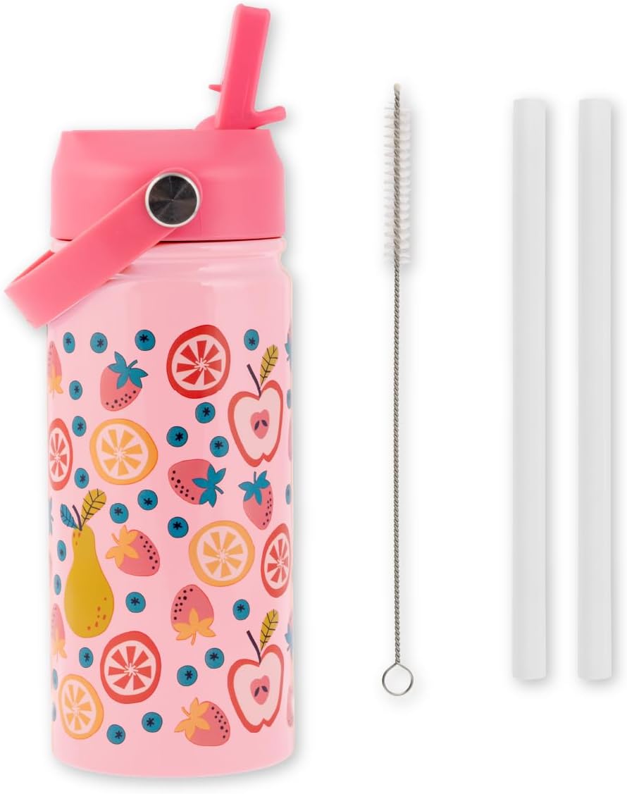 Keep your little one's drink at the perfect temperature for up to 6 hours with this adorable insulated stainless steel water bottle. The vacuum seal and leak proof lid make it perfect for on-the-go, and the pivoting handle and included straws make it easy for little hands to use. Includes 2 straws and cleaner BPA and PVC free Leak-proof lid Pivoting handle Holds temperature for 6 hours Approx. 2.75" x 2.75" x 7.5" (7cm x 7cm x 19cm) 14oz Stainless steel and PP plastic Dishwasher safe on top rack. Do not microwave