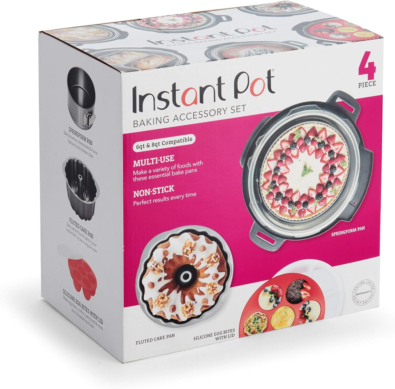 Make perfect desserts meals and snacks using this Instant Pot Official 4-Piece Baking Accessories Set specifically designed for use in your Instant Pot Use the Instant Pot Official Fluted Pan and Instant Pot Official Springform Pan to make delicious desserts and also delicious meals like meatloaf lasagna macaroni and cheese casseroles & more The Instant Pot Official Egg Bites Pan helps you make perfect portions from egg bites baby f..В ood muffins cupcakes & more You can serve cooking & even store it in the Egg Bites Pan which is freezer to Instant Pot compatible The Fluted Pan and Springform Pan are also safe to use in your regular oven All pieces are non-stick coating, meaning food will remain intact when removed and also allows for easy cleaning All pieces in this essential set are compatible with 6-quart and 8-quart cookers.