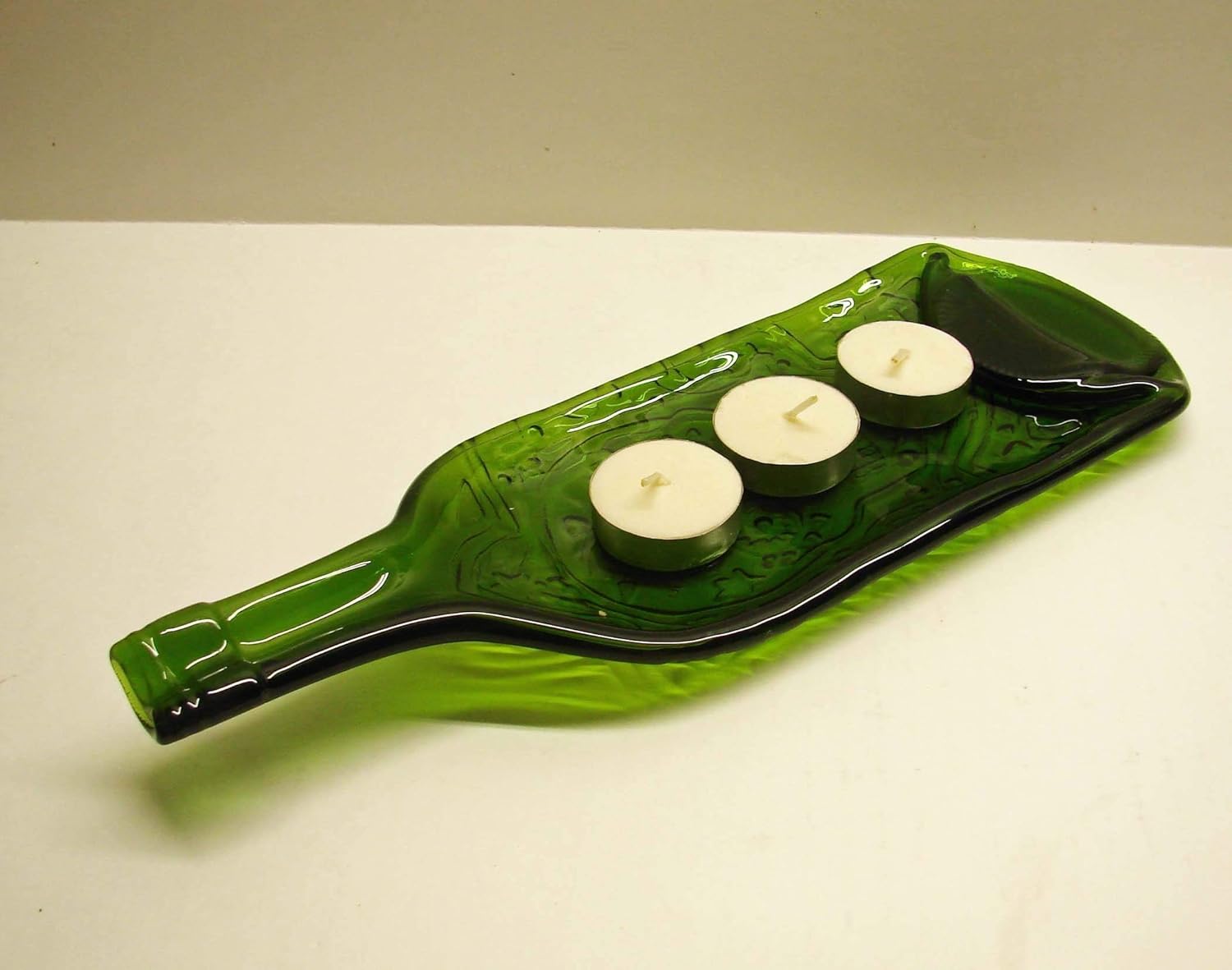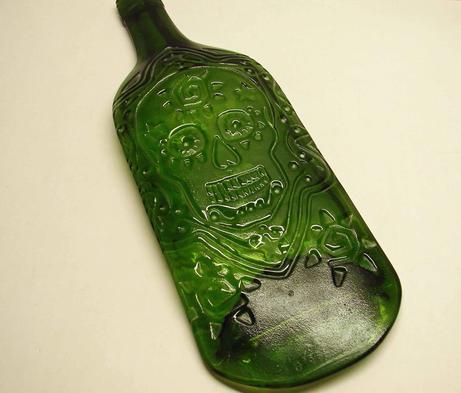 This is a moss green wine bottle that I placed in a mold inside my kiln to give it a concave shape and a sugar skull design embossed on the back. It can be used as a decorative bowl, serving dish, an ashtray, a trinket dish, the possibilities are endless. Dimensions 11 3/4" by 4"