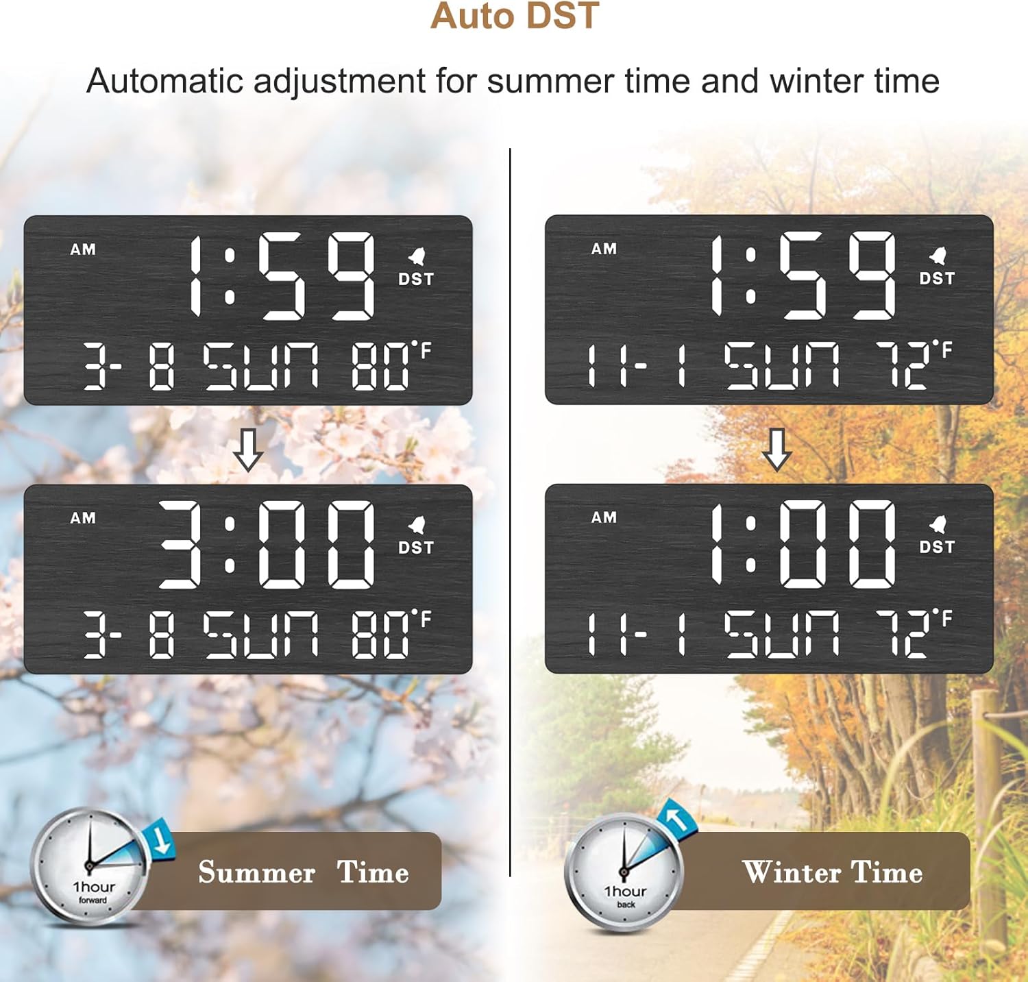 | Additional Features | large digital wooden alarm clock for bedroom with big led numbers, usb port, 0-100% brightness dimmer, indoor thermometer, date, day of the week, snooze, adjustable alarm volume, room decoration decor |