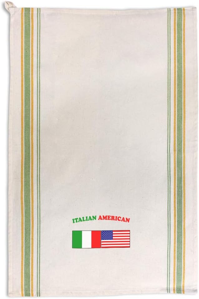 Personalized Kitchen Towels Bar Accessories & Decor Dish Towels Cook in style with our 18x28 inches 100% cotton Eco-friendly kitchen towel. Make this hand towel your best companion when you clean or cook delicious tasty meals in your kitchen. You can use this striped hand towel in multiple ways such as drying dishes, wrapping bread, cleaning spills or simply take it with you in your picnic hamper!The design's text reads: italian american. GREAT HOUSEWARMING GIFTS IDEA: Unforgettable, our kitchen hand towels are the perfect for birthday gifts, anniversaries, Mother's Days, Father's Day, Valentine's Day, Christmas or any other celebrations. Perfect for someone who is looking for American Flag white hand towels, Italian Flag kitchen dish towels, Italian American Citizen tea towel, American cotton towels, Italian kitchen dish cloths kitchen towels, cotton dish towels, hanging kitchen towels, household essentials, . You can make these large flour sack dish towels one of a kind with our custom option with thousands of designs and graphics available to you. Simply add your personalized text and choose among various fonts and colors! Our designs are professionally printed on our dishcloths for kitchen with state-of-the-art equipment guaranteed to last for years. PERFECT COMPANION FOR COOKING & CLEANING! ** Made from high quality Eco-friendly 100% cotton ** Large size 18x28 inches ** Corner hanger loop for an easy hanging & display ** 4-sided hem for best durability ** Washer & dryer friendly for an easy care ** Design professionally printed ** Multiple usages: cooking, cleaning, drying, wrapping bread, picnic etc...